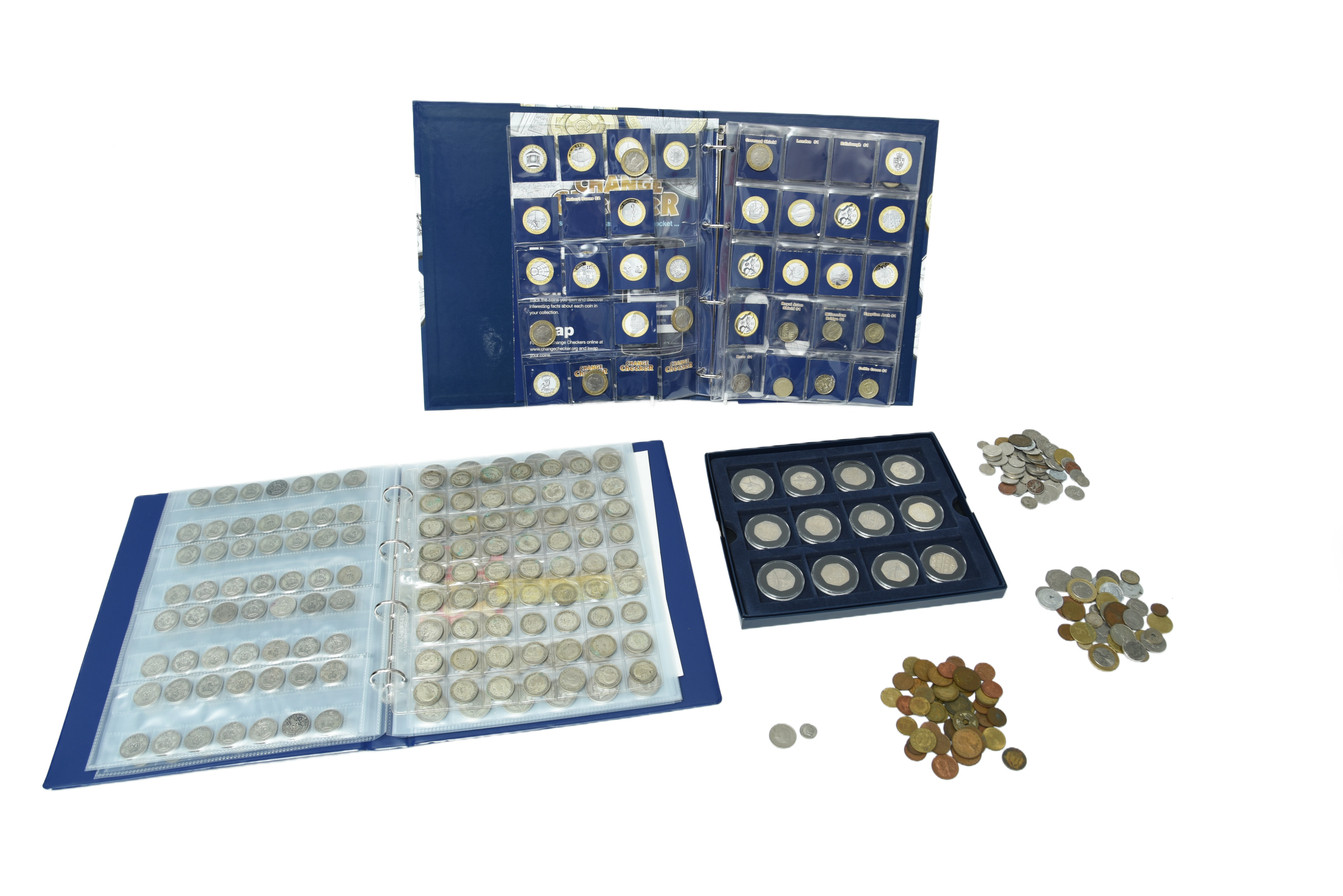 A small quantity of coins, international, including themes fifty pence issues, British late pre-decimal low denominations coins, and other items. [qty]