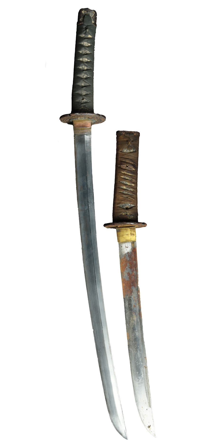 A Japanese sword (o-wakizashi), blade 20 in., hon-zukuri, mumei, copper niju-habaki, iron mokko-gata tsuba with foliate decoration in light relief and matching fuchi and kabuto-gane, black laquered saya, kogatana with kozoka adorned with a pelican; together with a Japanese dagger (tanto), blade 11.75 in., hira-zukuri with hi, mumei, iron hilt fitting of the type often associated with the Satsuma rebellion, black laquered saya with vacant accommodation for a kogatana. [2]