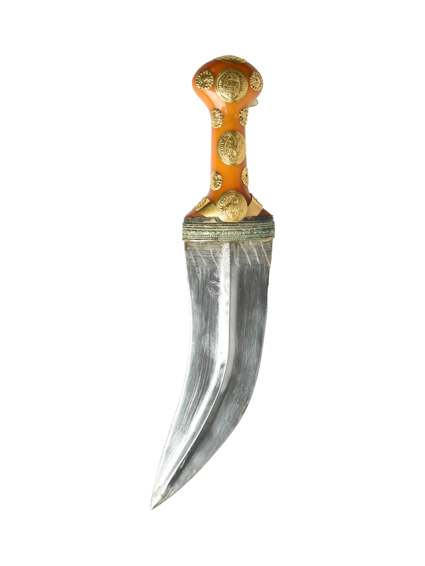 A Yemeni dagger (jambiya), broad curved blade 7 in. with medial ridge, hilt of faux amber set with gold ornaments including discs representing Byzantine coins, leather scabbard with tooled decoration.