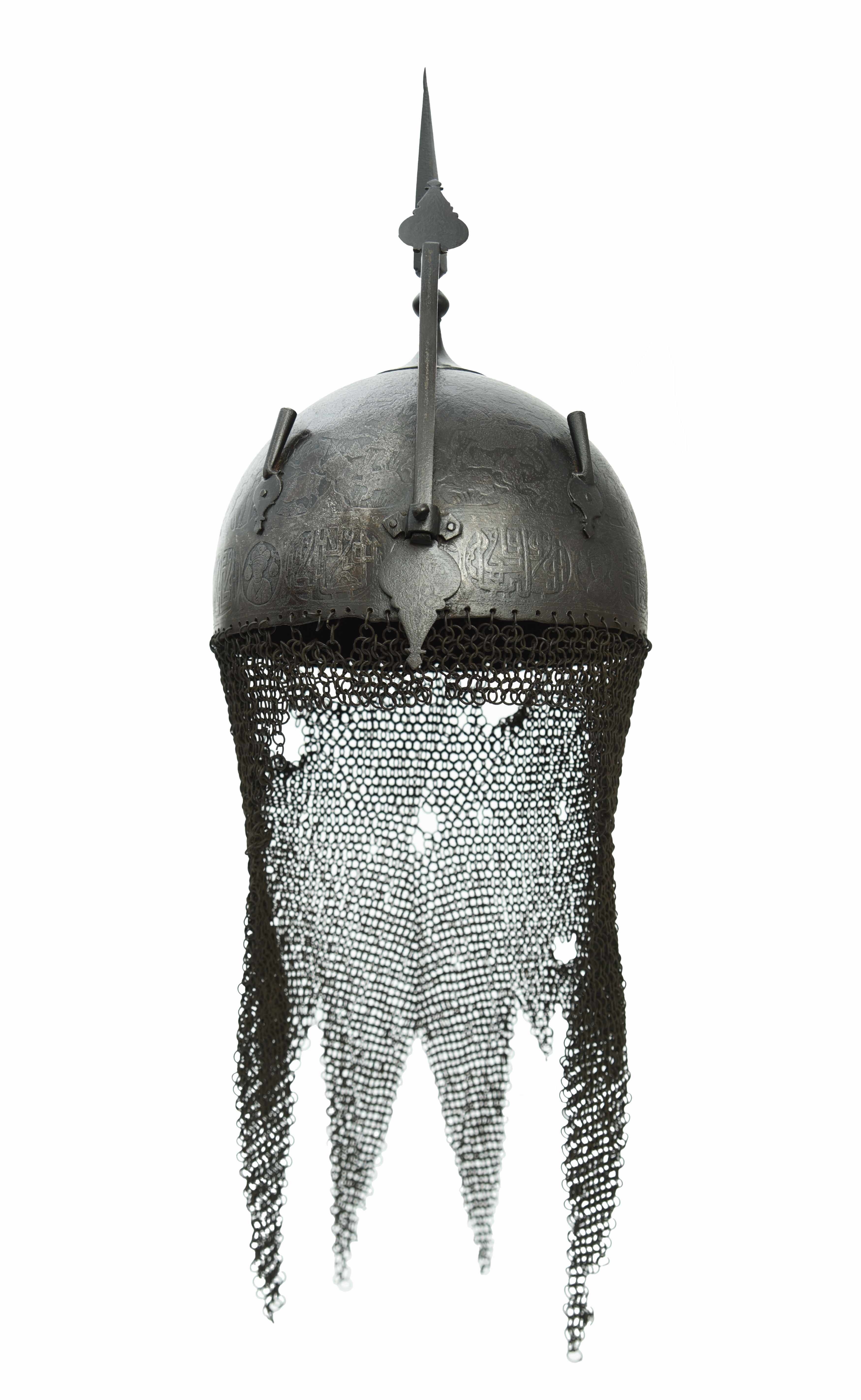 A Persian helmet (khula-khud), steel bowl with nasal bar secured by a screw, twin plume holders, square-section top spike on a baluster stem rising from a round foot, the surface of the bowl decorated all over in low relief with hunting scenes above a frieze of alternating portrait vignettes and panels of text, a mail skirt suspended from the rim.