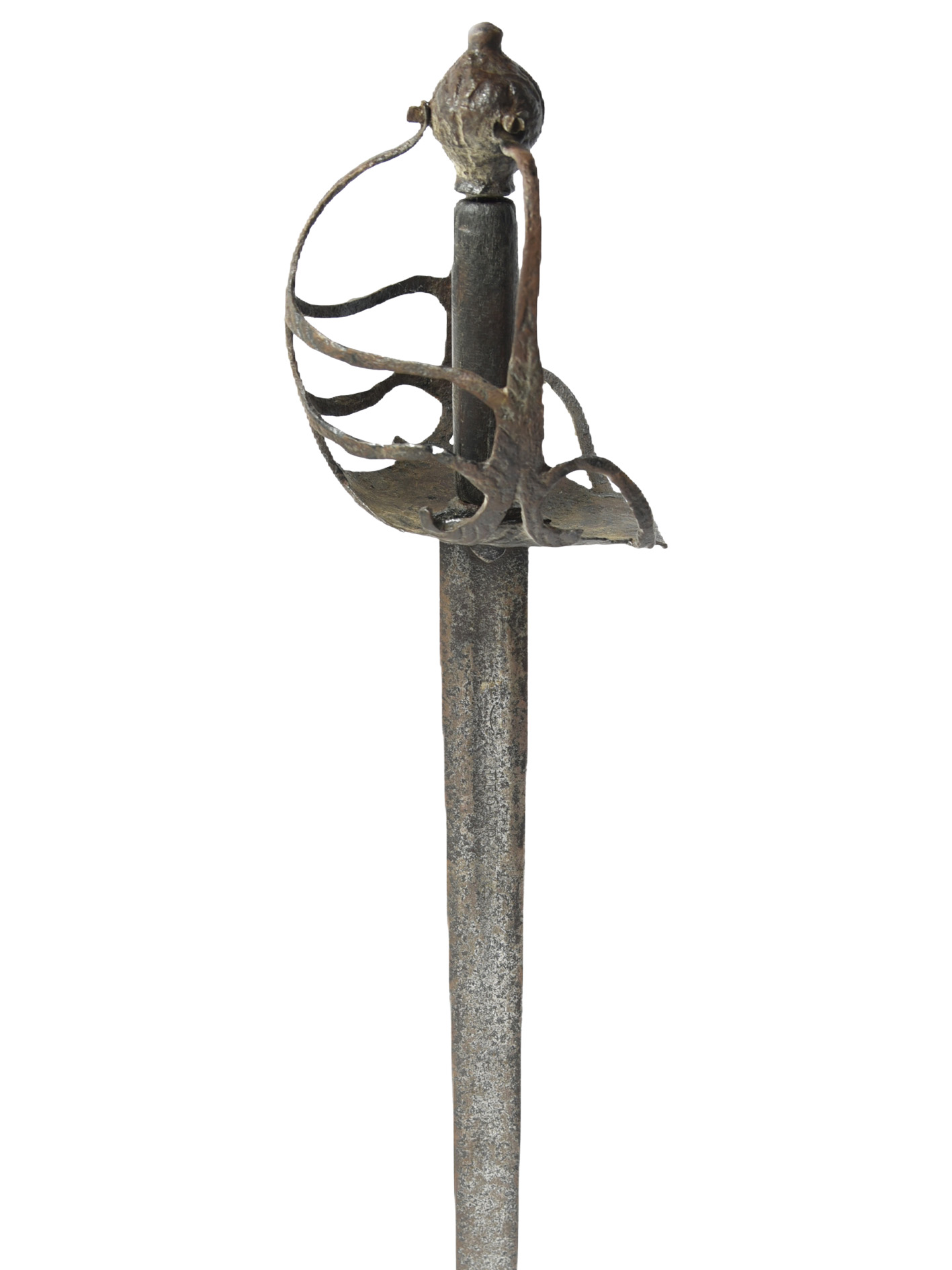 A 17th century English basket-hilted cavalry sword, double-edged blade 31.75 in., shallow fuller