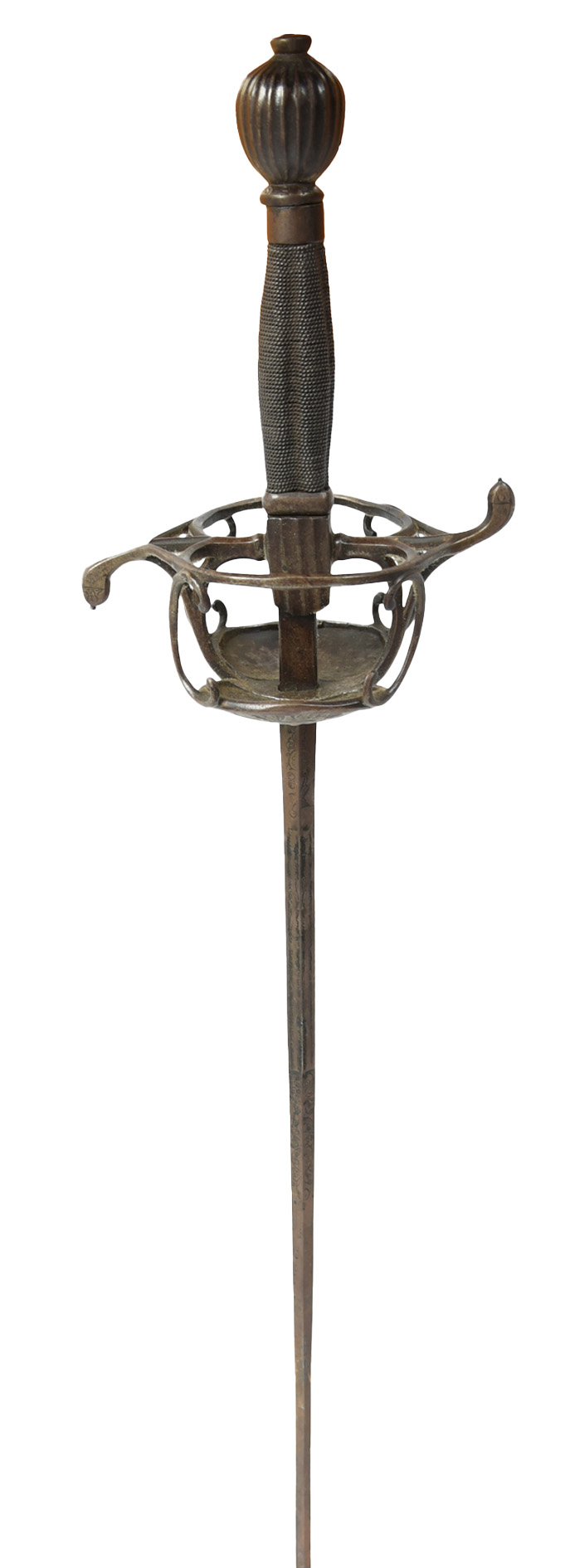 A 17th century light rapier, slender diamond-section blade 38.5 in., slightly bevelled and fluted at the forte and with etched decoration; steel hilt retaining traces of gilding, double shell guards each with a sun-in-splendour in low relief, shells joined to the large side rings by bifurcated arms and with the intervening space also occupied by C-scroll bars, re-curved quillons, fluted quillon block, heavy fluted pommel, wire bound grip.