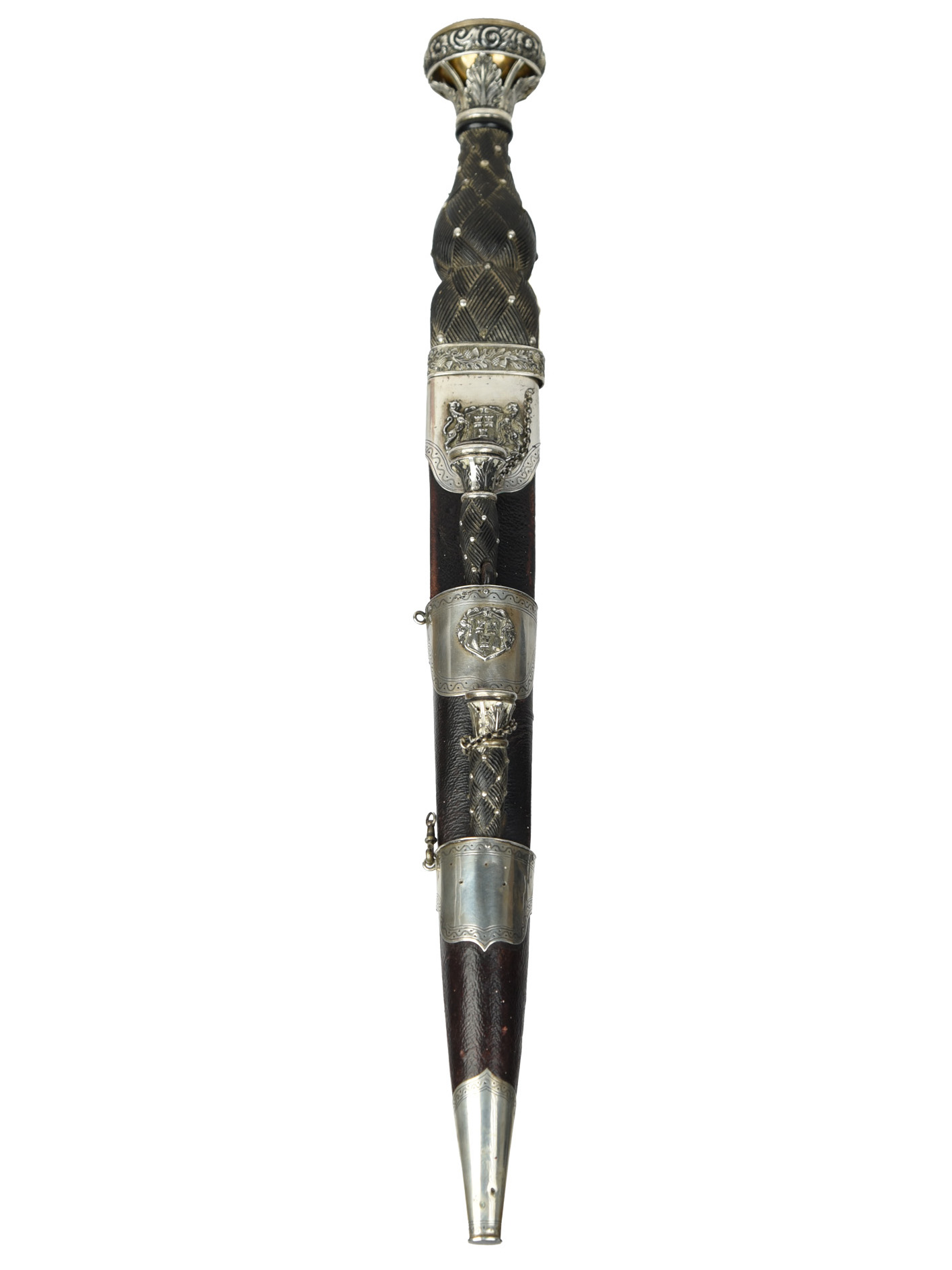 A Scottish dress dirk bearing the arms of Aberdeen, blade 12 in. with scalloped back edge, retailed by A & J Smith, white metal mounted hilt with bulbous bog oak grip carved with a basket-weave pattern accented with white metal beads, the collar and pommel with foliate decoration in low relief and the latter set with a large cairngorm; white metal mounted and black leather covered scabbard with the arms and motto of Aberdeen to the locket and the upper collar and accomodating a near-pair of by-knife and fork mounted in the same manner as the dirk.