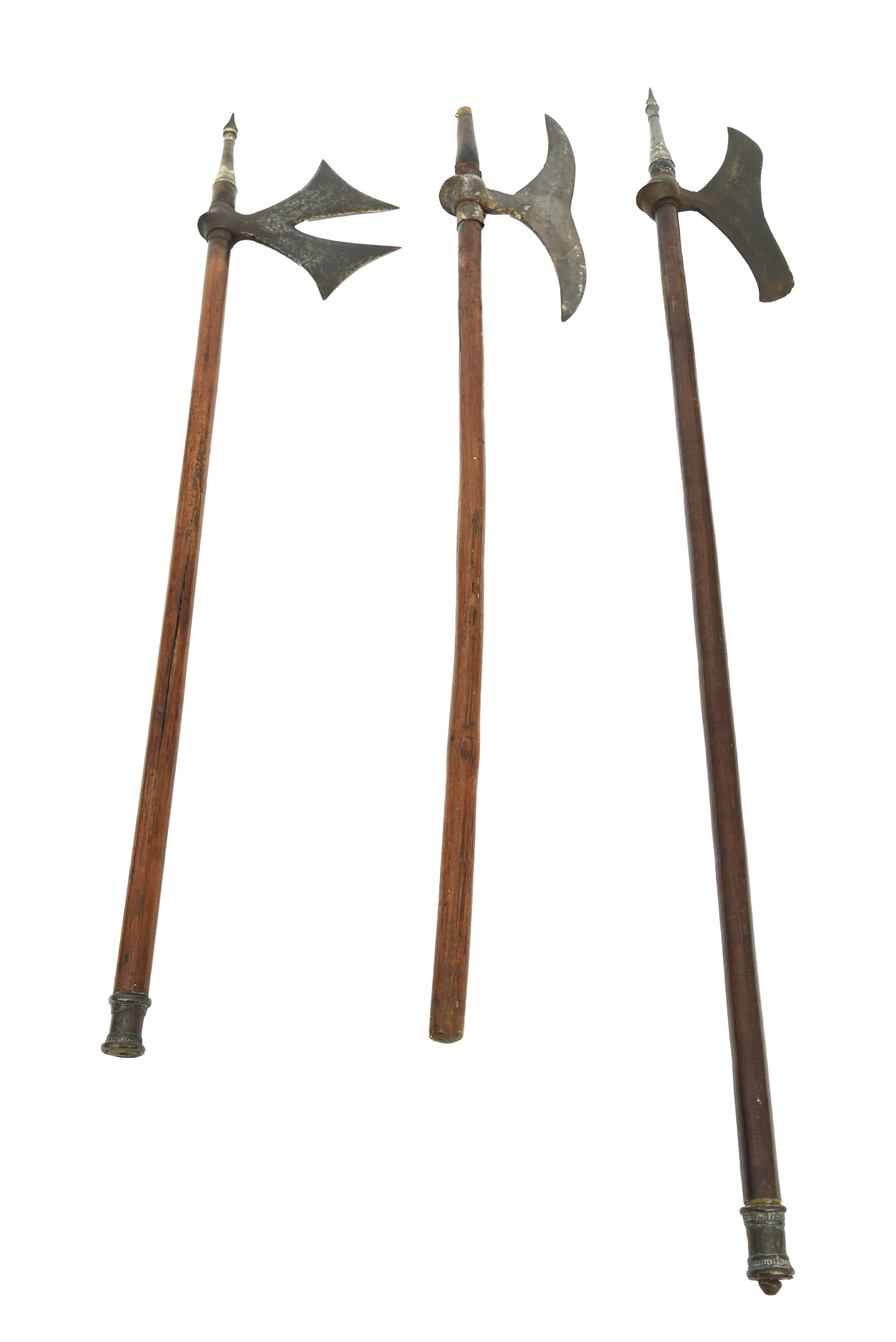 Three Indian axes (bulova), the first with angular bifurcated blade, brass and iron top spike and a brass collar to the foot of the slender shaft; the next similar but with a long blade with a re-curved edge; the last with blade of similar form to the second but mounted on a plain shaft. [3]