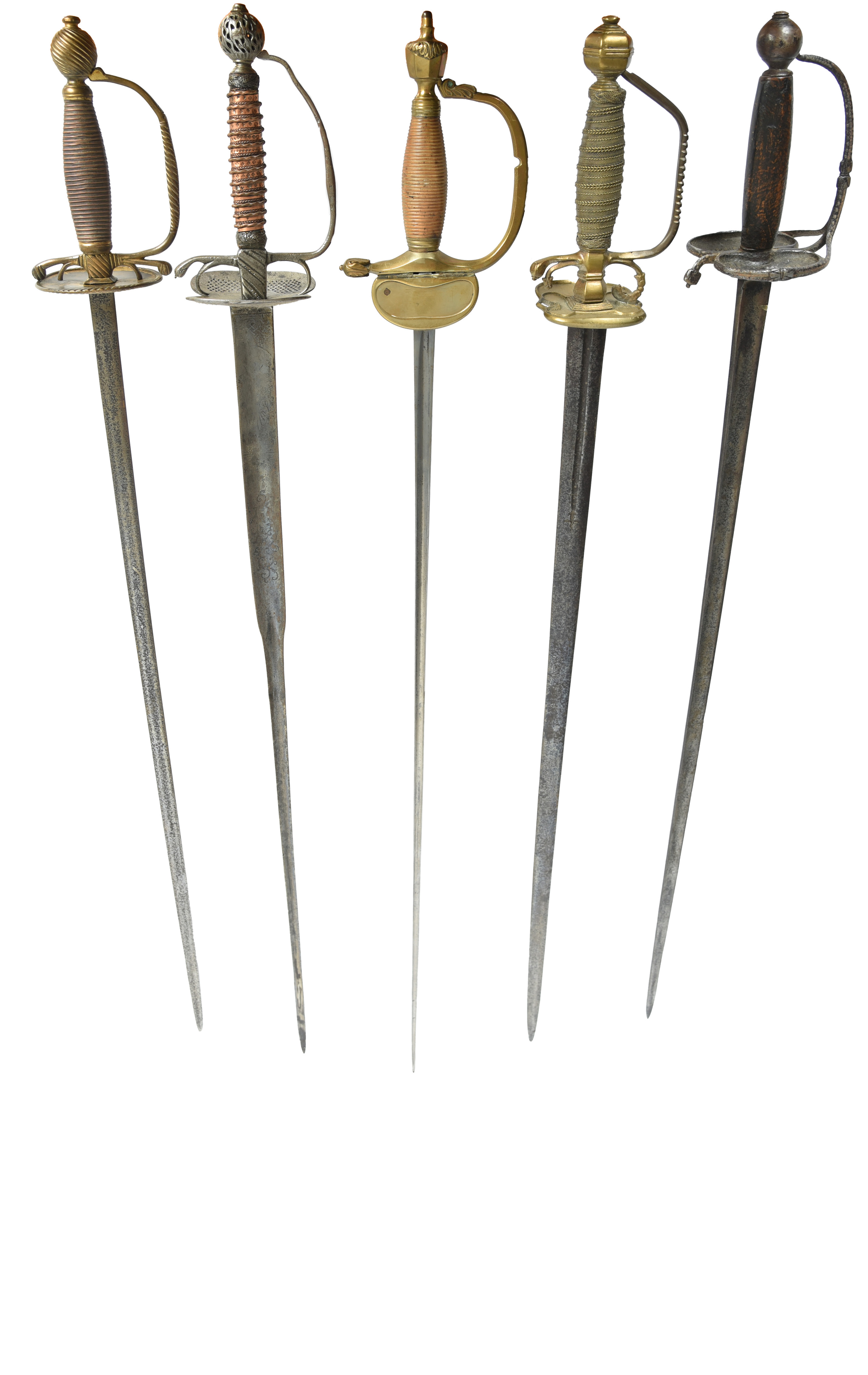 A small collection of smallswords and related weapons, comprising: an 18th Century French smallsword with 32.5 in. collichmarde type blade, etched decoration to the forte, double shell guard, openwork pommel, copper wire and tape-bound grip (purchased at the old Louvre des Antiquaire shoppoing centre); an 18th century single-edged sword with Walloon type hilt of diminutive proportions, the iron guard with chased lattice decoration, spherical pommel; a brass hilted swallsword, stout double-edged blade 31 in., brass hilt with square guard embellished with green man details and a raised border, quillions, arms and knuckle bow with decorative accents, urn-shaped pommel; a later smallsword or court sword with gilt-brass hilt, oval guard with fluted border, fluted quillon black and knuckle bow; and a composite sword with slender hollow-triangular-section blade 33.5 in., mated to a British 1798 pattern infantry officer's hilt. [5]