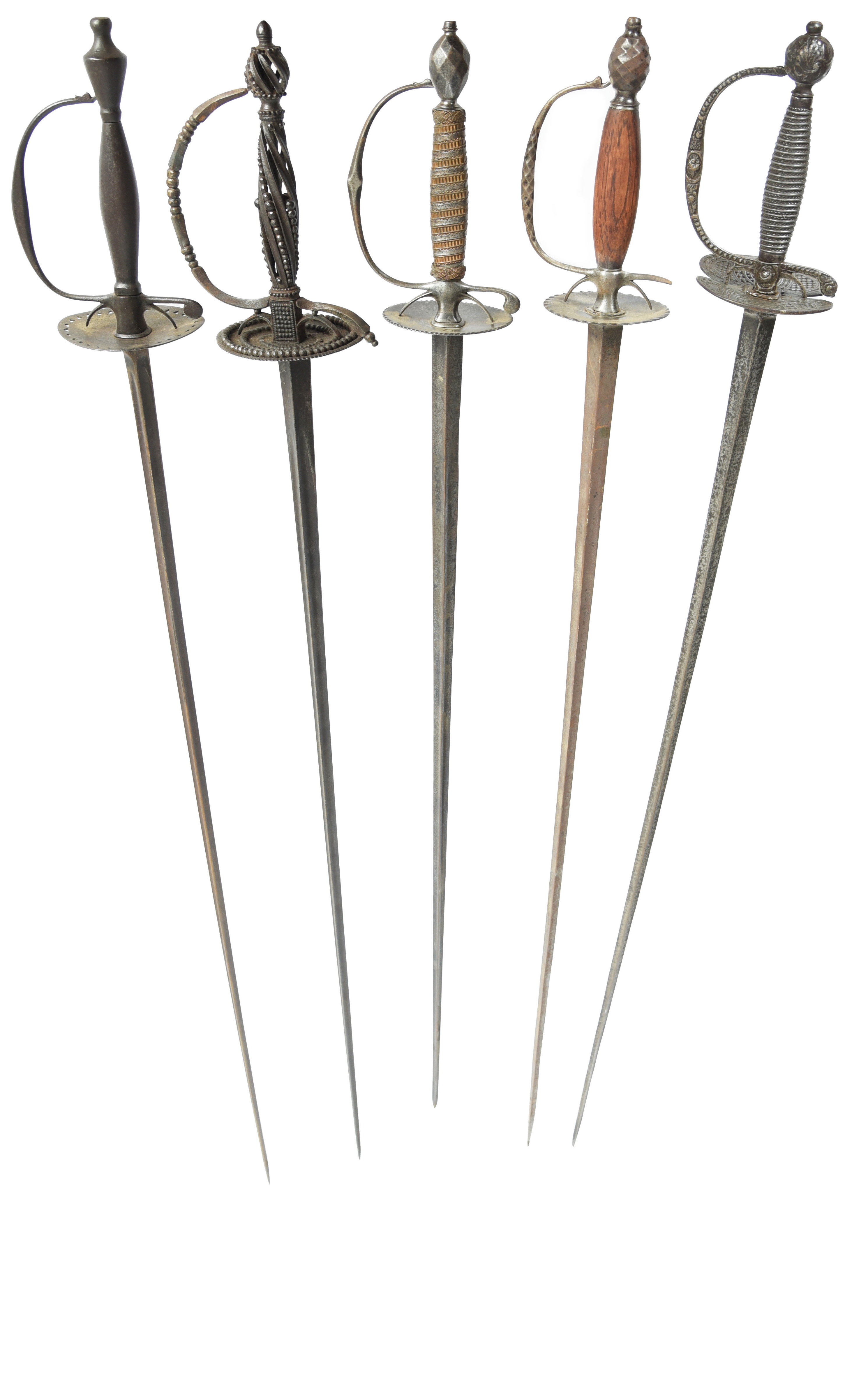 A small collection of court swords and related weapons, comprising: a 19th century sword with slender triangular-section blade 33.5 in., steel hilt with pierced guard and embossed with classical motifs; a 19th century court sword with steel hilt, oval guard with concentric borders of beading to the inner face, grip and pommel formed of spiralling bands with faceted beads set between them; a late 18th century smallsword with faceted pommel; and two similar swords. [5]