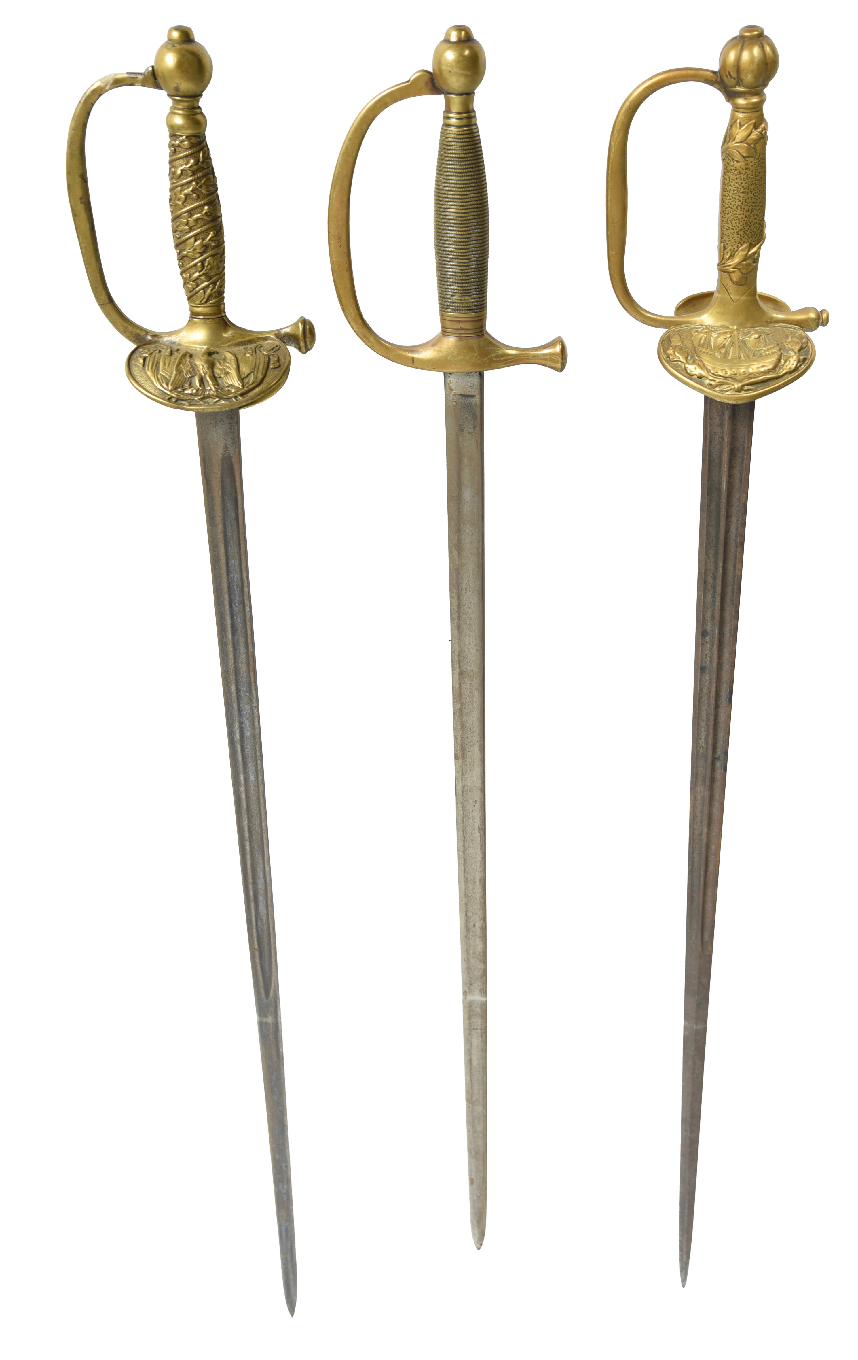 Three 19th century brass-hilted uniform swords: i) a French sword attributed to the Paris Fire Brigade, straight double-edged bi-fullered blade 30 in., cast hilt with large outer shell embossed with a ship in relief, the grip cast with a twining laurel branch, slender knuckle bow, fluted pommel; ii) a French officer's sword, of similar form, the flat backed blade 30.5 in. and stamped 'C&C'. the outer shell embossed with a eagle, the folding inner guard with spring detent; iii) a United States military bandsman's sword, single edged blade 28.25 in., brass stirrup hilt with beaded grip. [3]