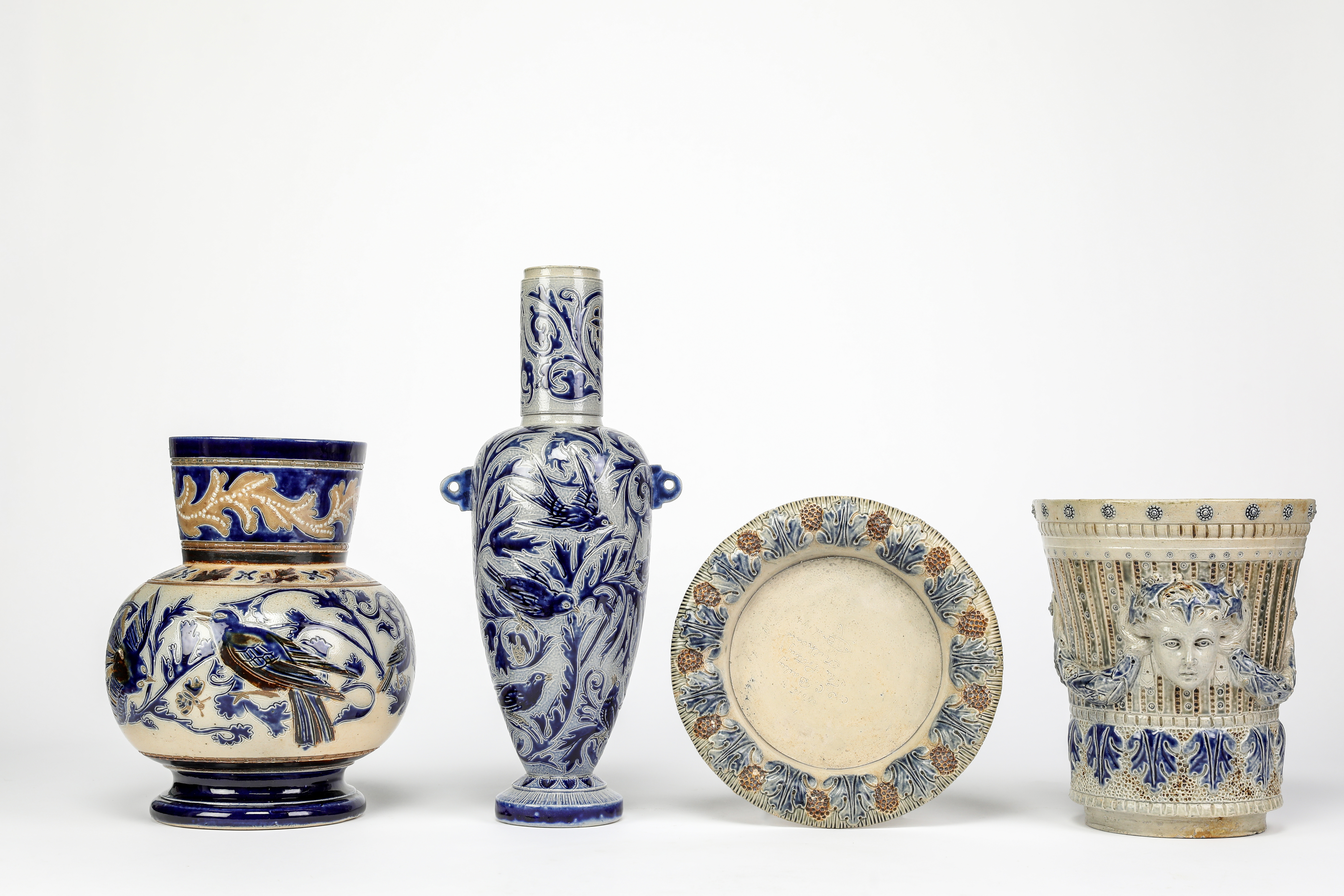 27cm high; and a tall C I C Bailey Fulham vase by Edgar Kettle, 39cm high, and a Fulham Pottery plant pot and dish (4).