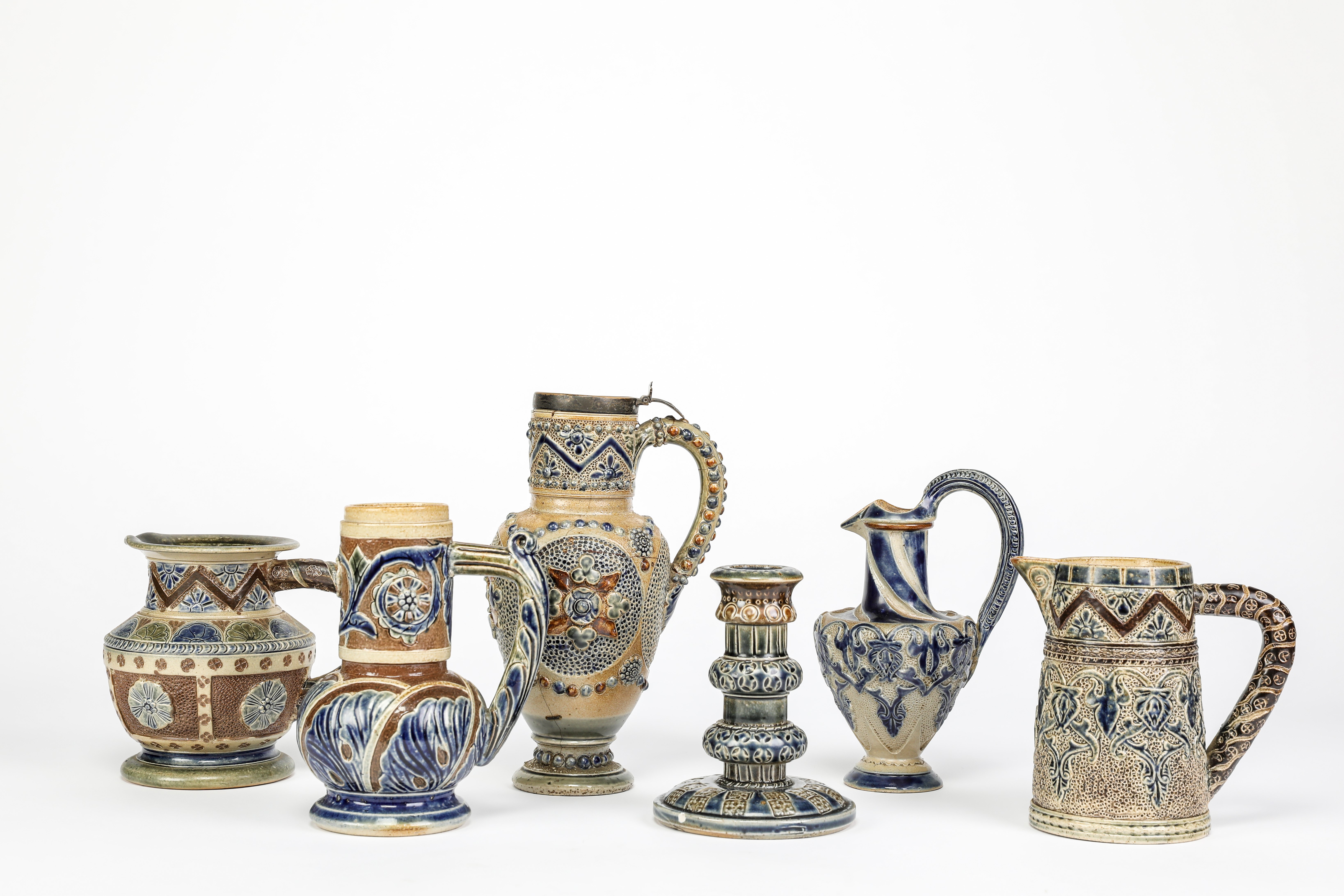 19cm high; and four jugs and a candlestick, all by Edgar Kettle for C.I.C. Bailey Fulham Pottery (6).