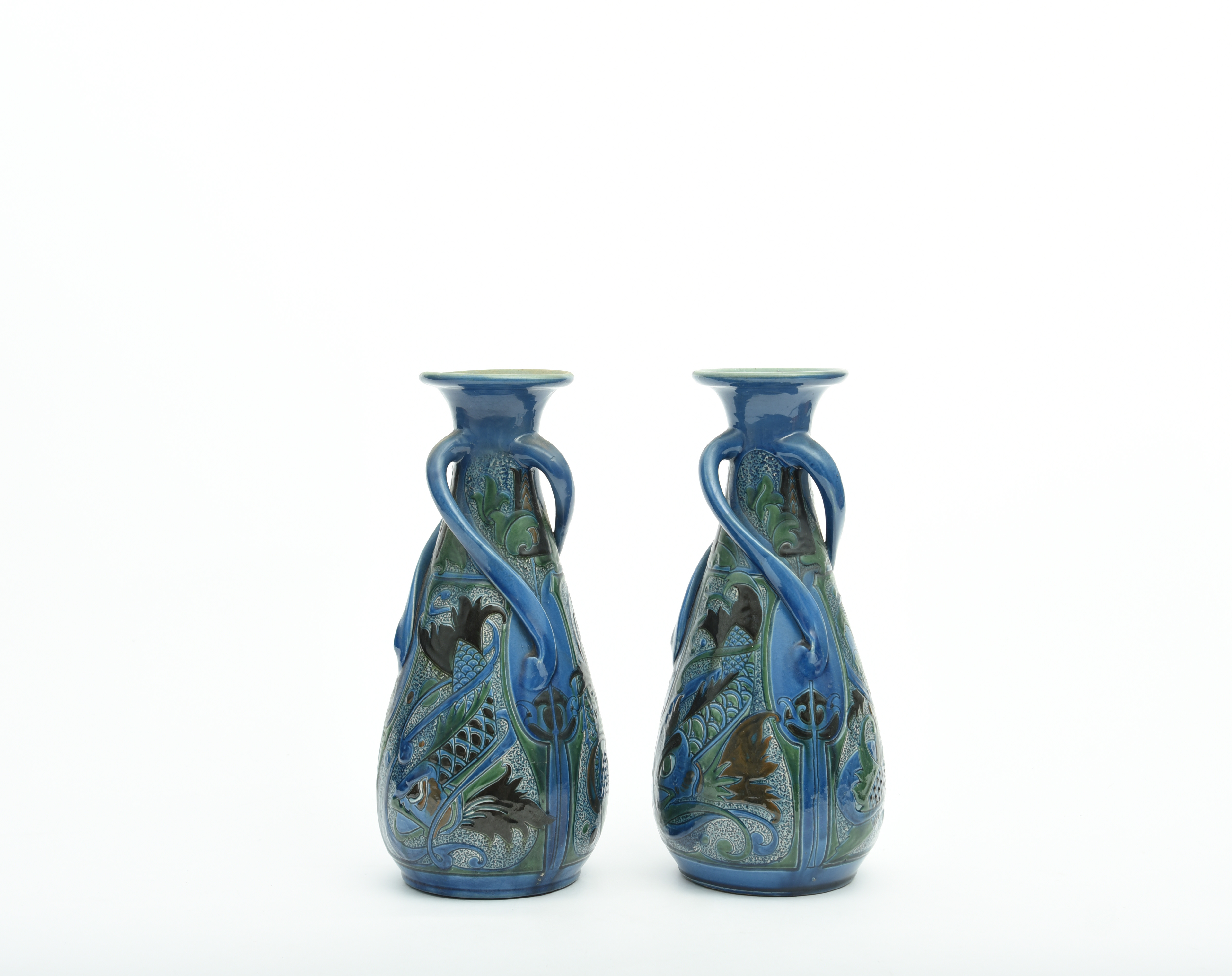 with three twisted handles, incised and carved with fish in blue, green, and brown