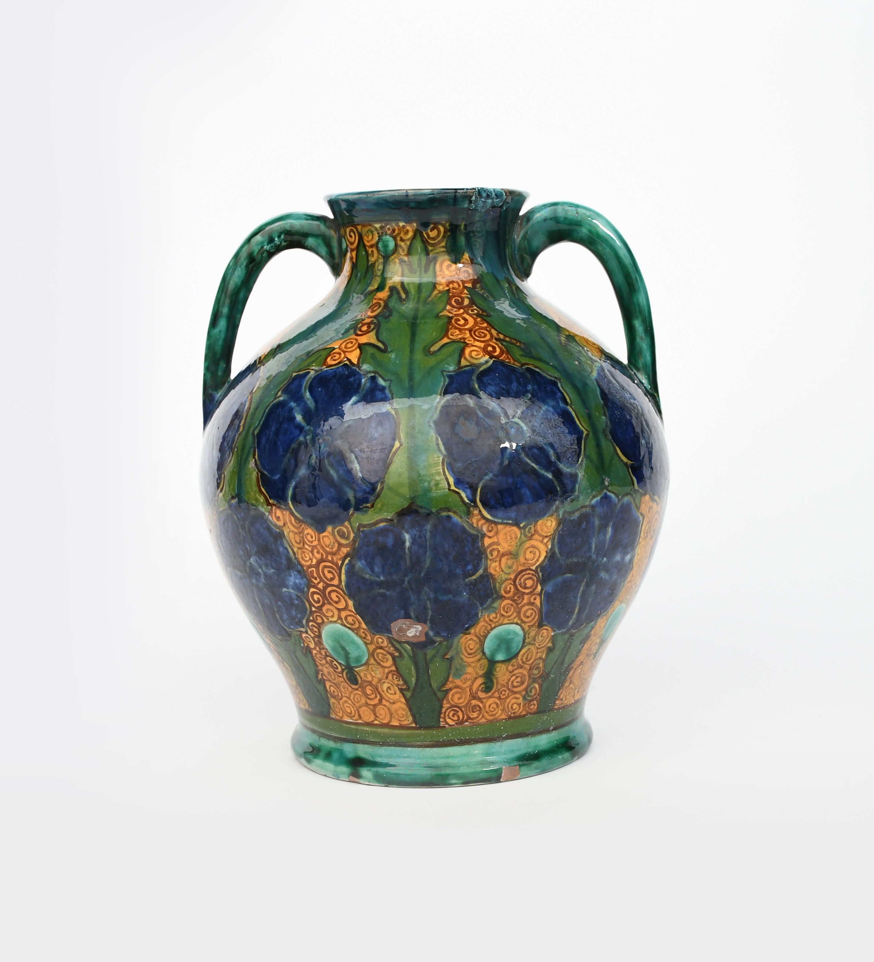 shouldered ovoid form with applied handles, painted with panels of stylised flowers and foliage in blue, green and chestnut on a yellow ground