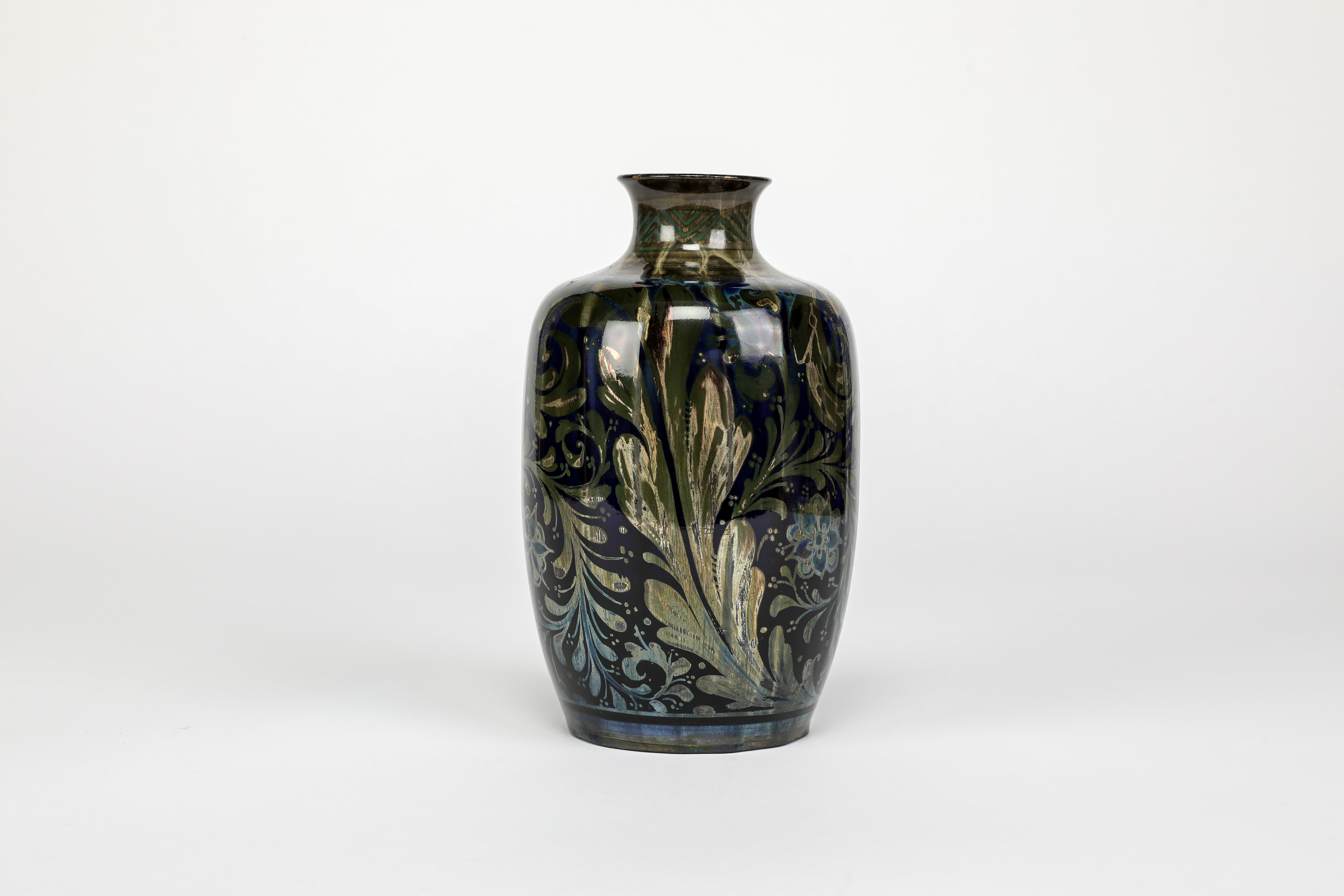 cylindrical shouldered form, decorated with silver lustre on a blue ground, depicting foliage within stylised borders to the neck