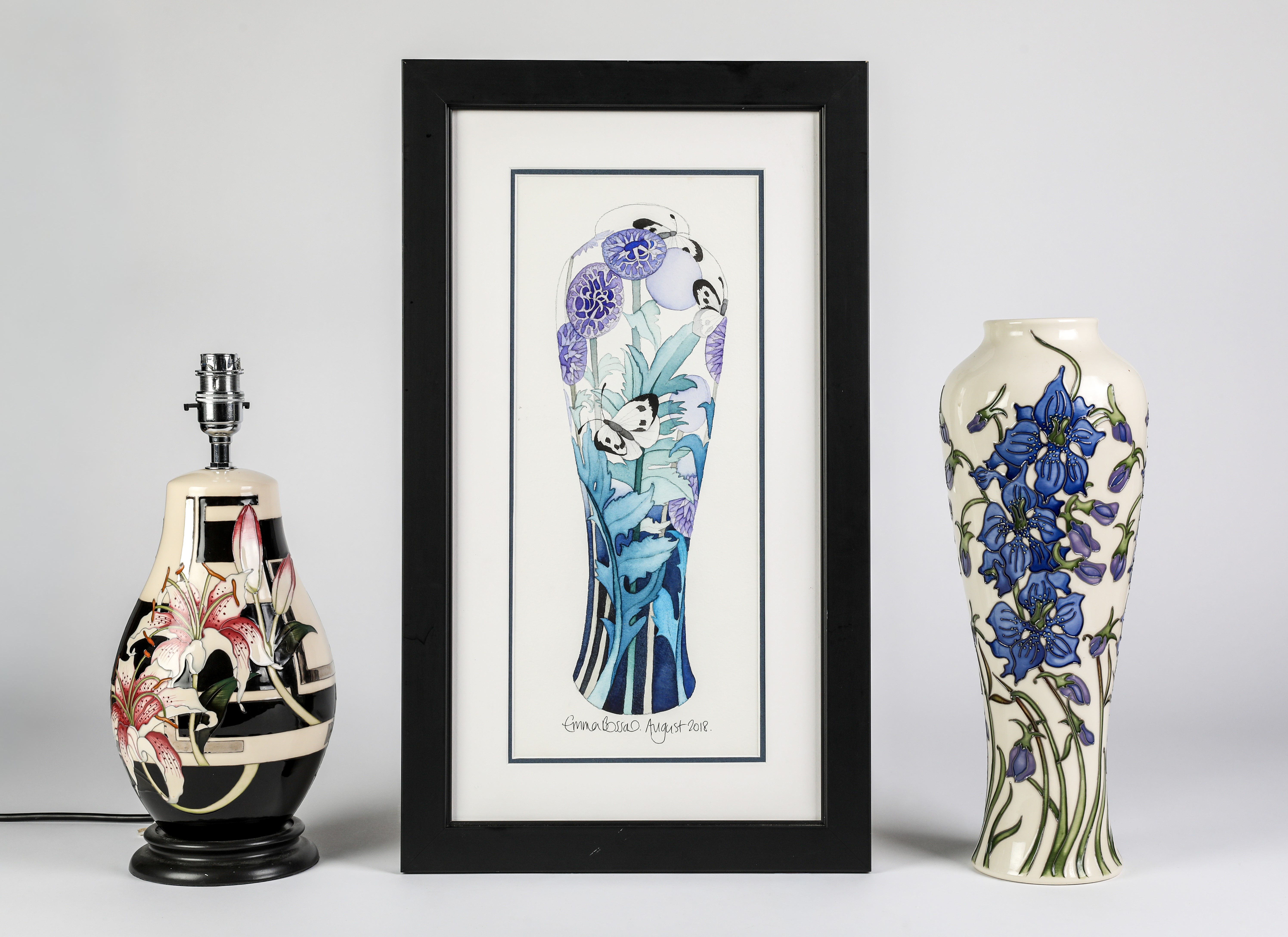 37cm high; with a Moorcroft Stargazer Lily lamp with shade, and a watercolour of a Moorcroft vase by Emma Bossons (4).