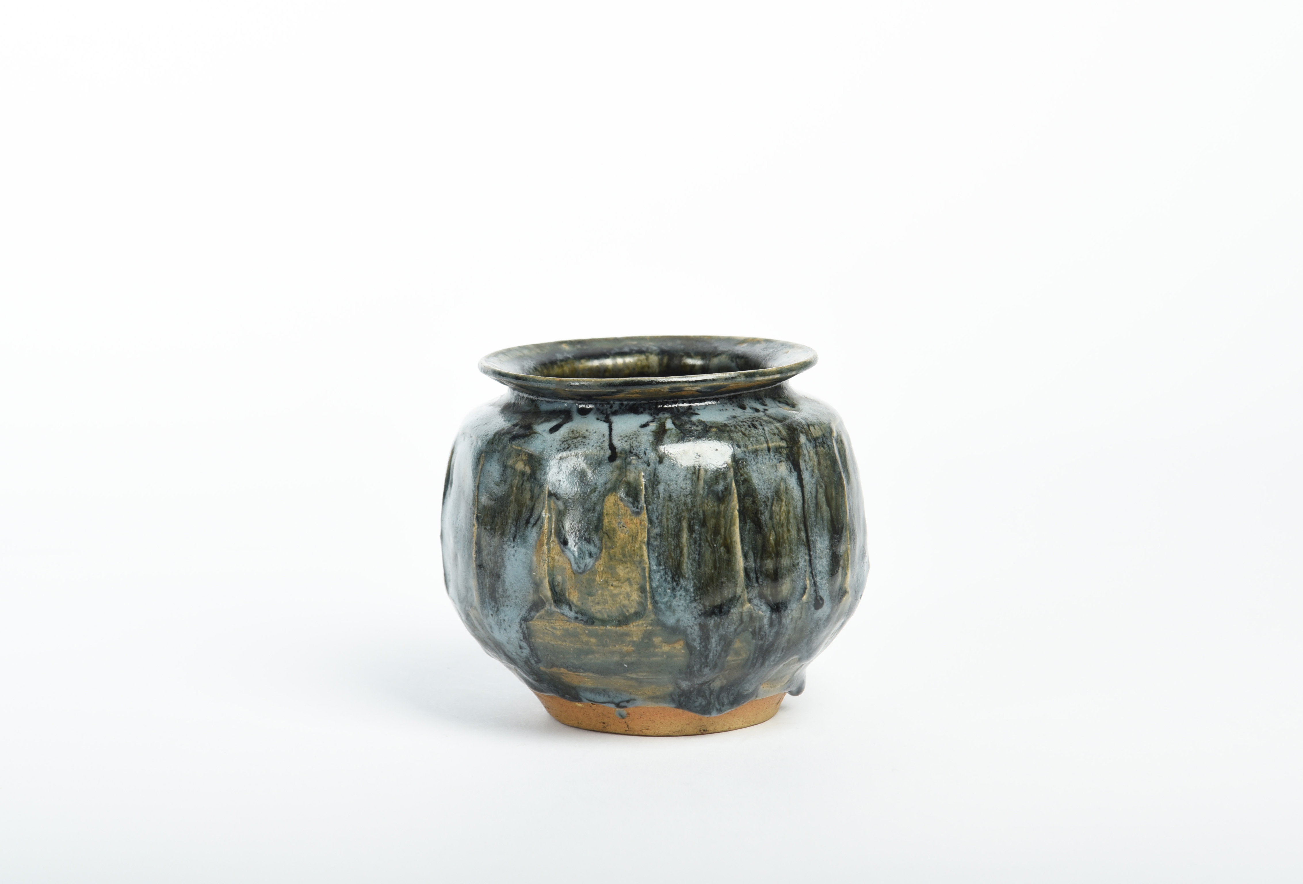 compressed form with fluted sides, covered in a blue and grey glaze to the foot