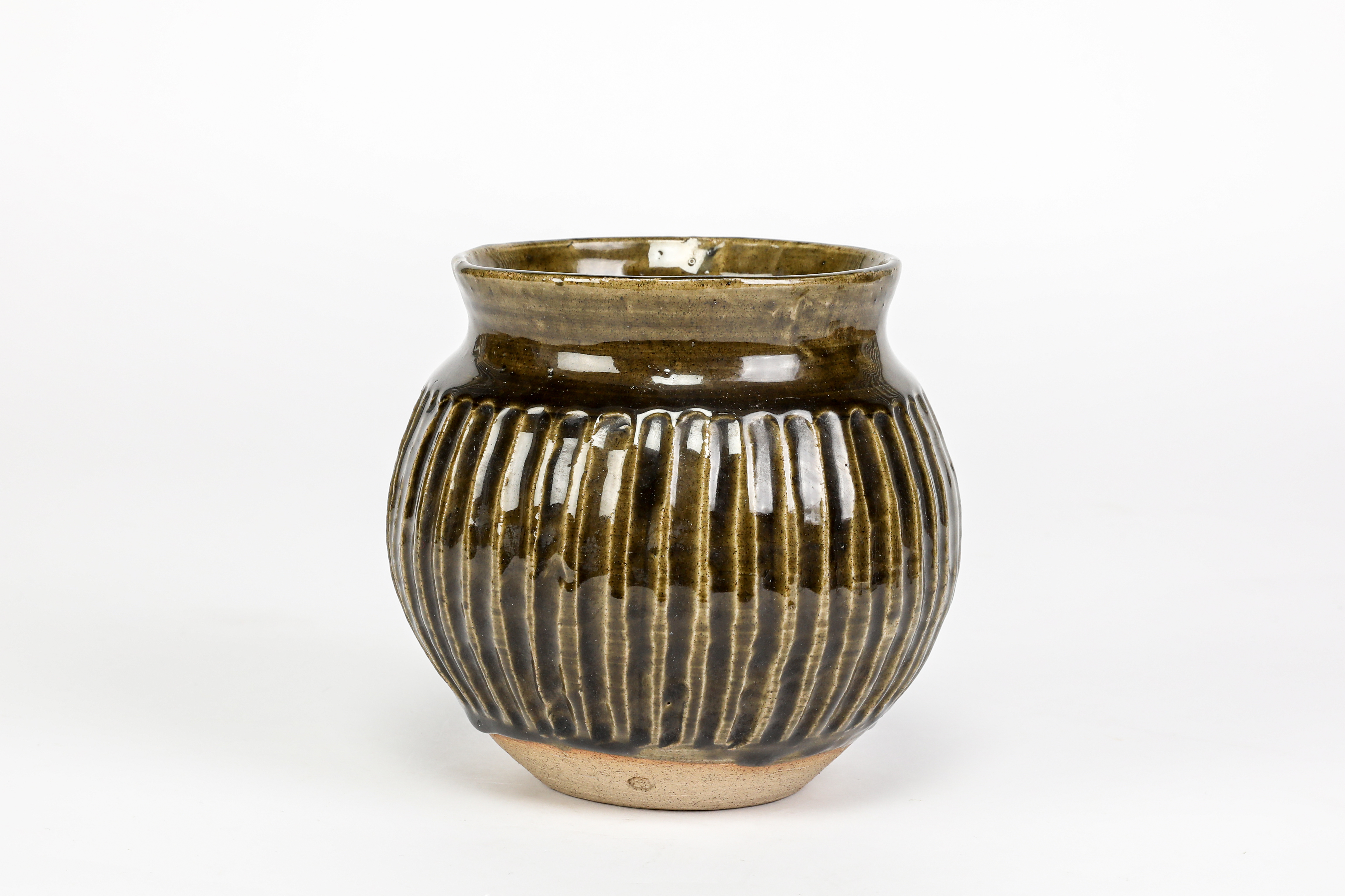 squat form with fluted sides, covered in a dark green glaze