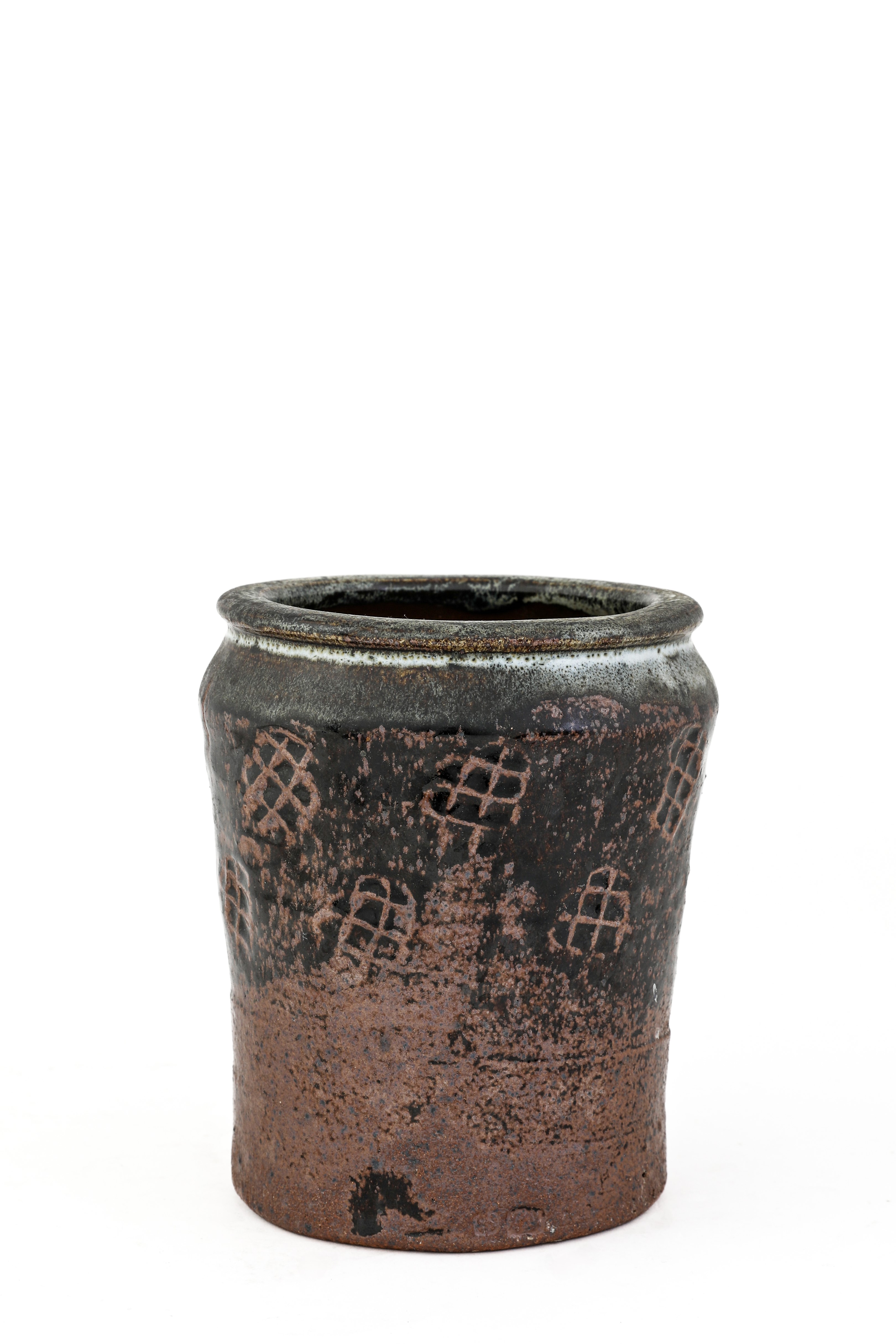 cylindrical form, with a tenmoku glaze and nuka glaze rim, impressed motifs to the body