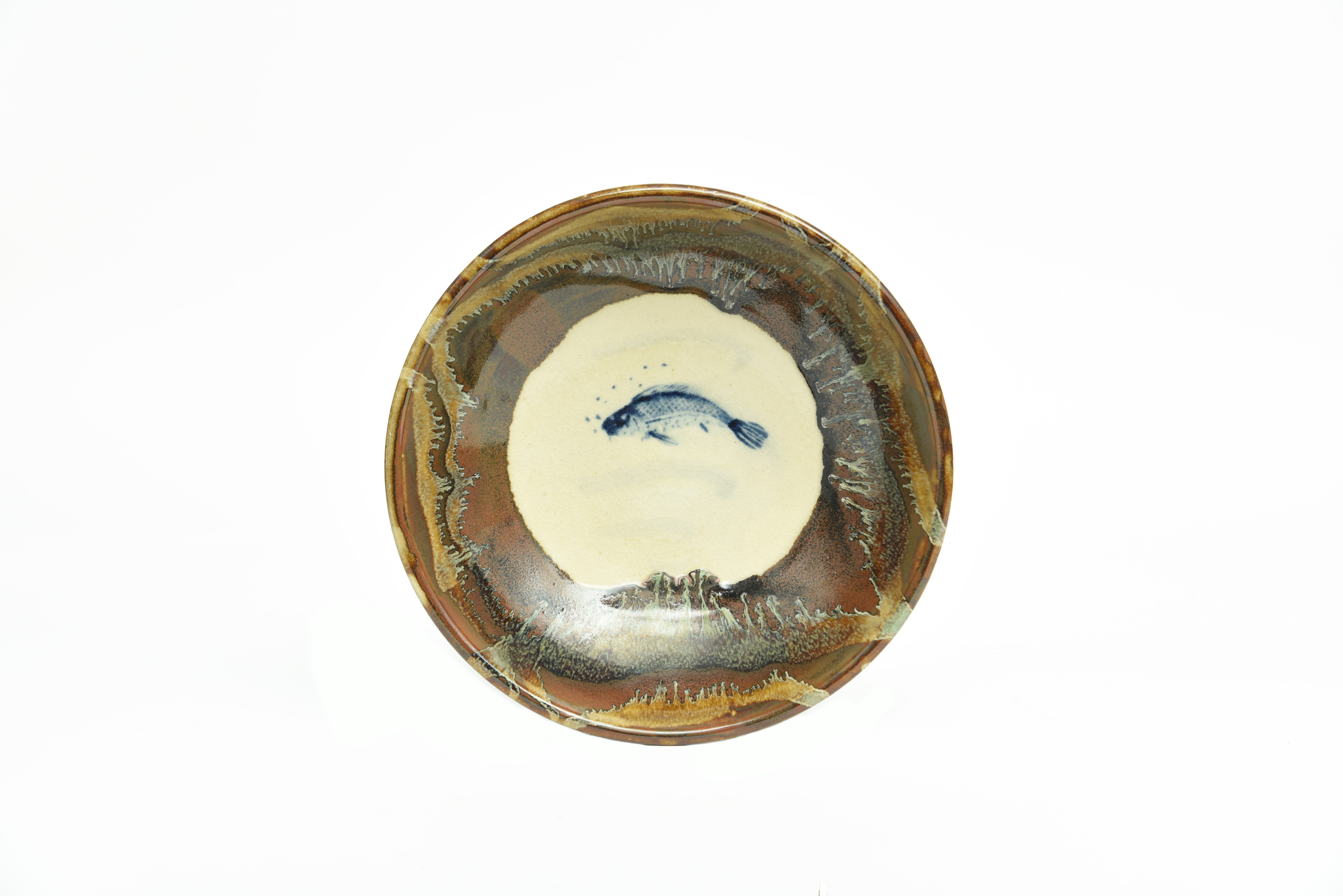 decorated with a brushwork fish to the well, within a border of iron, nuka, and chun glazes running from the rim