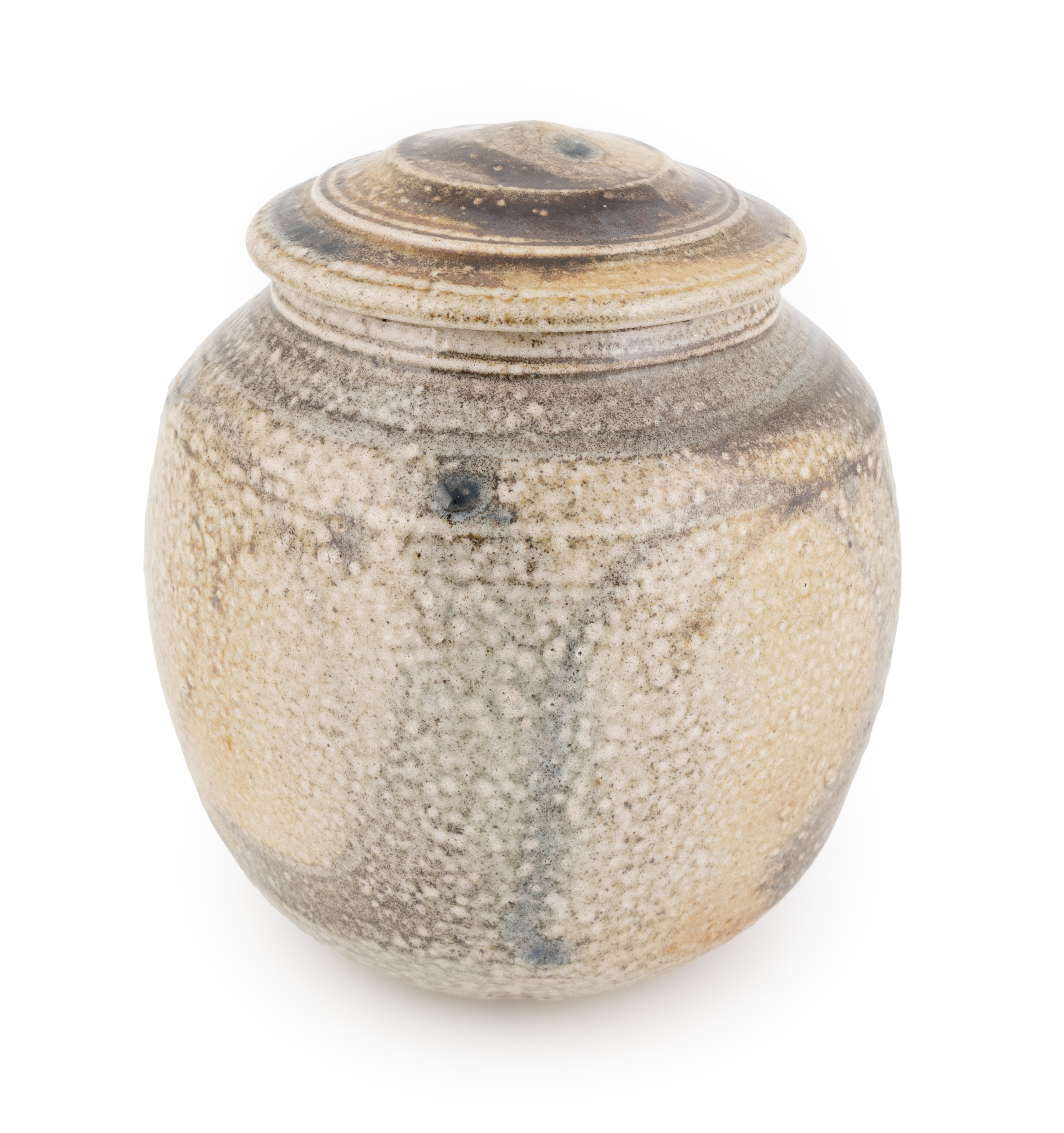 shouldered, square section, painted with simple design in ochre and green on a mushroom ground