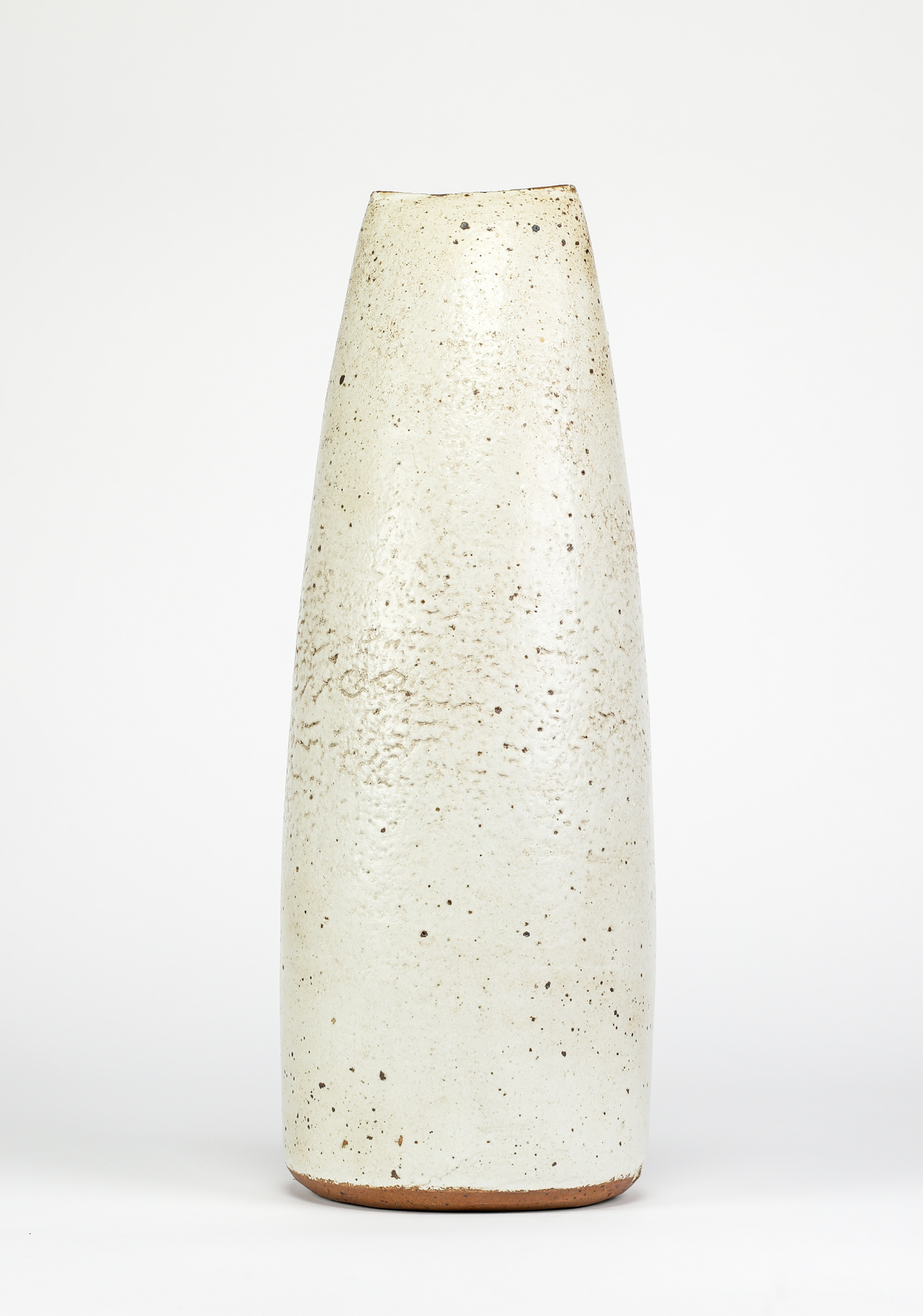 stoneware, covered in a cream mottled glaze with an iron speckle, the cylindrical form with tapered neck and a pinched oval rim