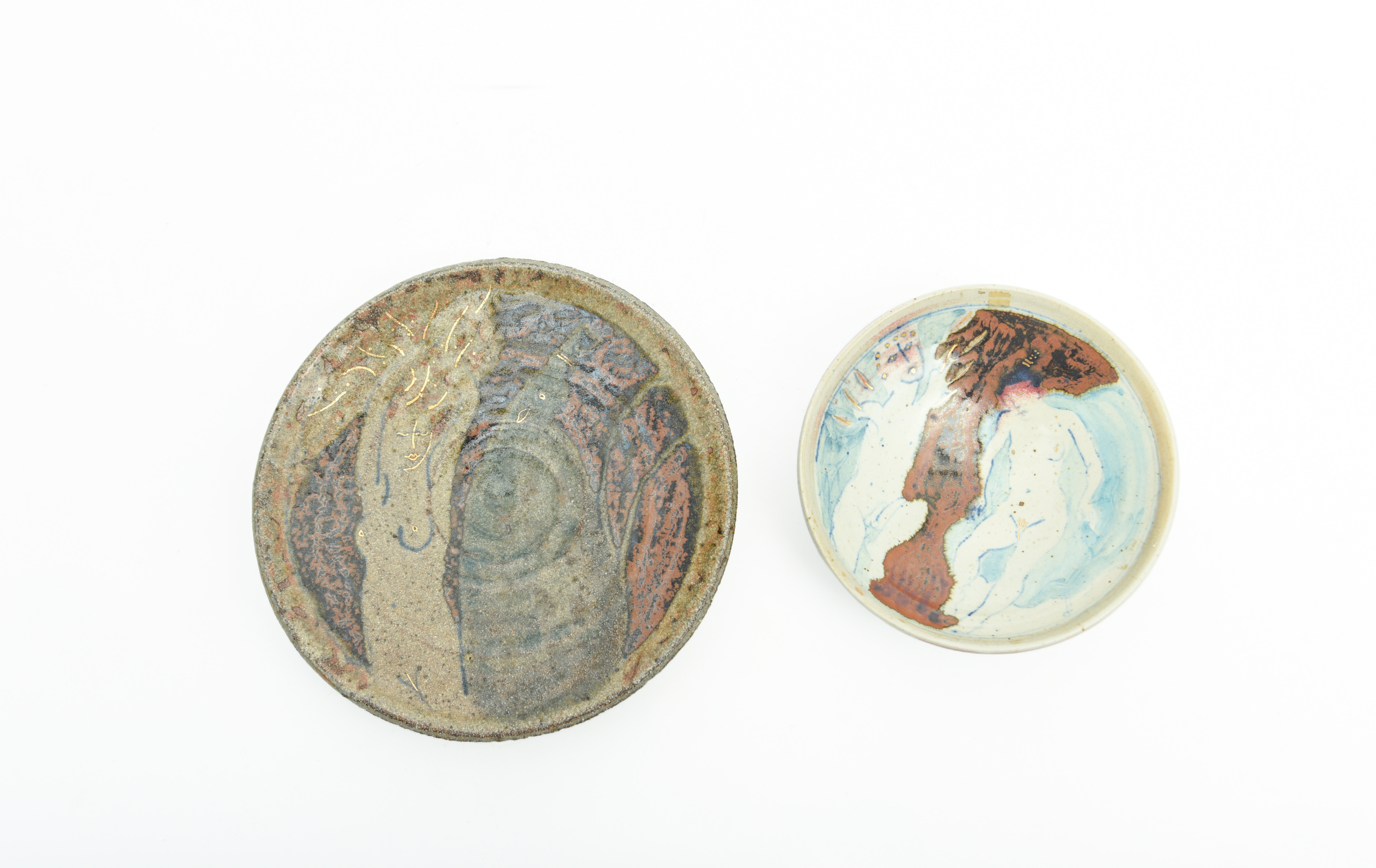 14cm diameter; and a similar stoneware dish by Eric James Melon, 19cm diameter (2).