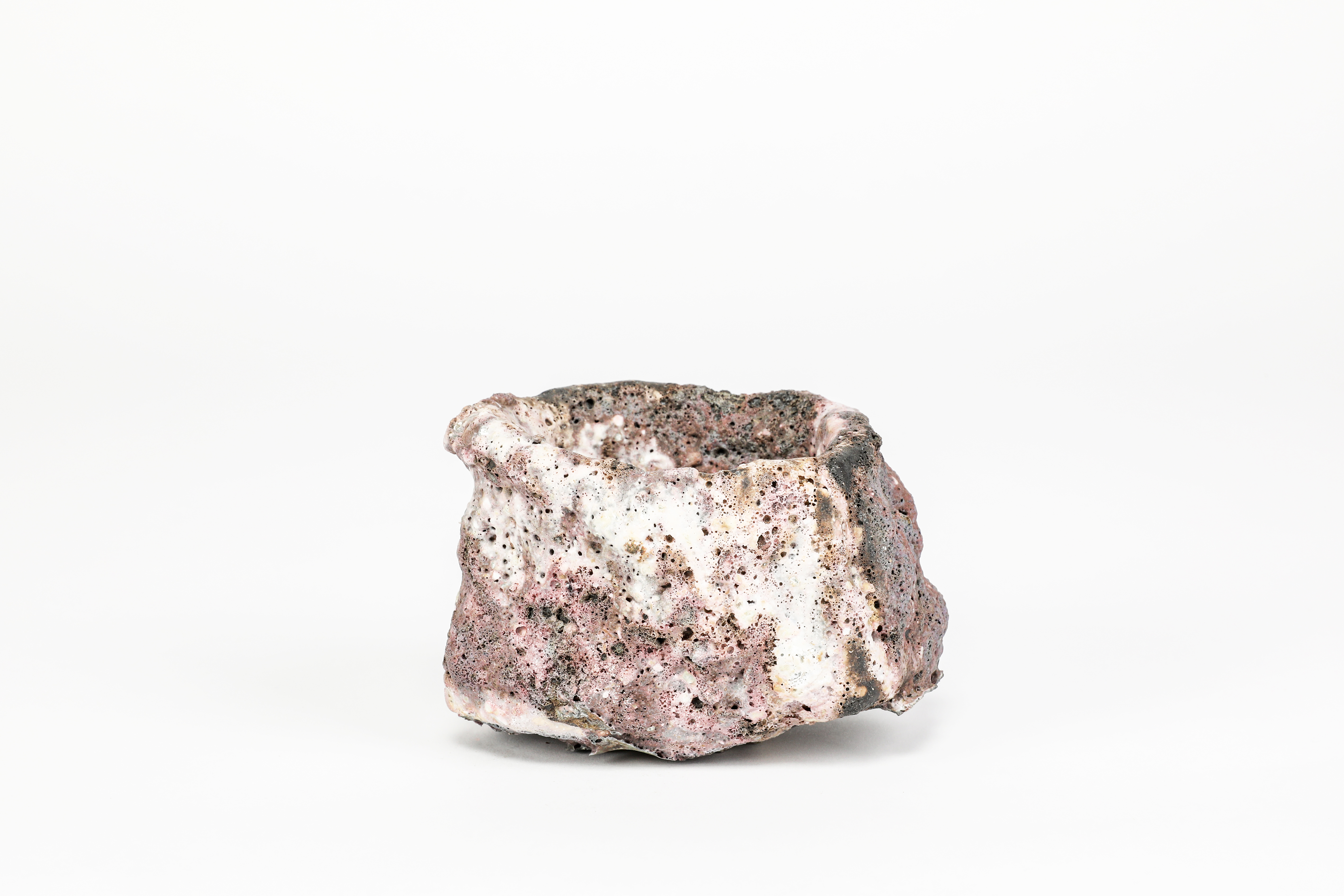 stoneware, covered with pink and white running volcanic slips