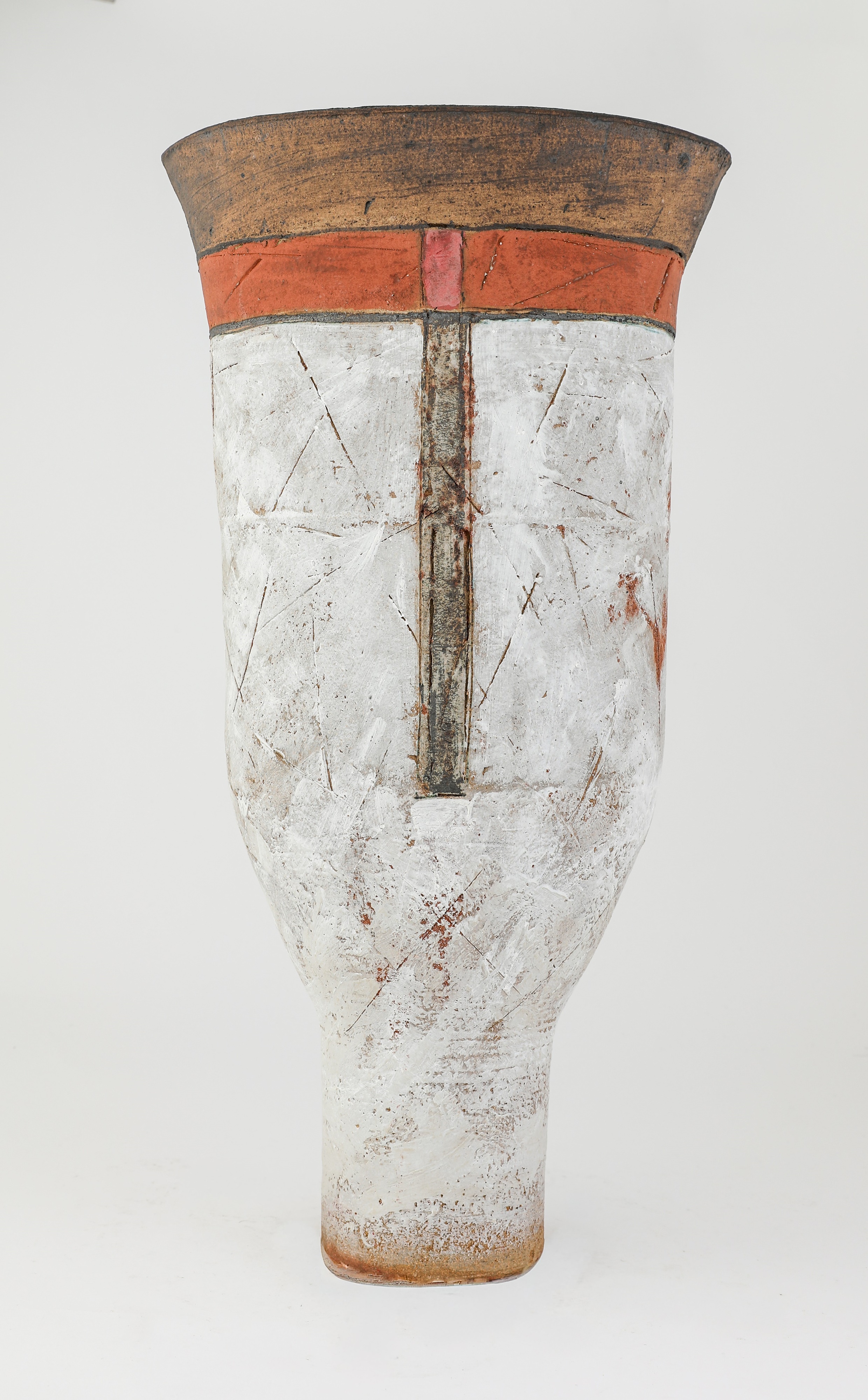 inverted form, covered in a white glaze with bands of red and bronze to the rim