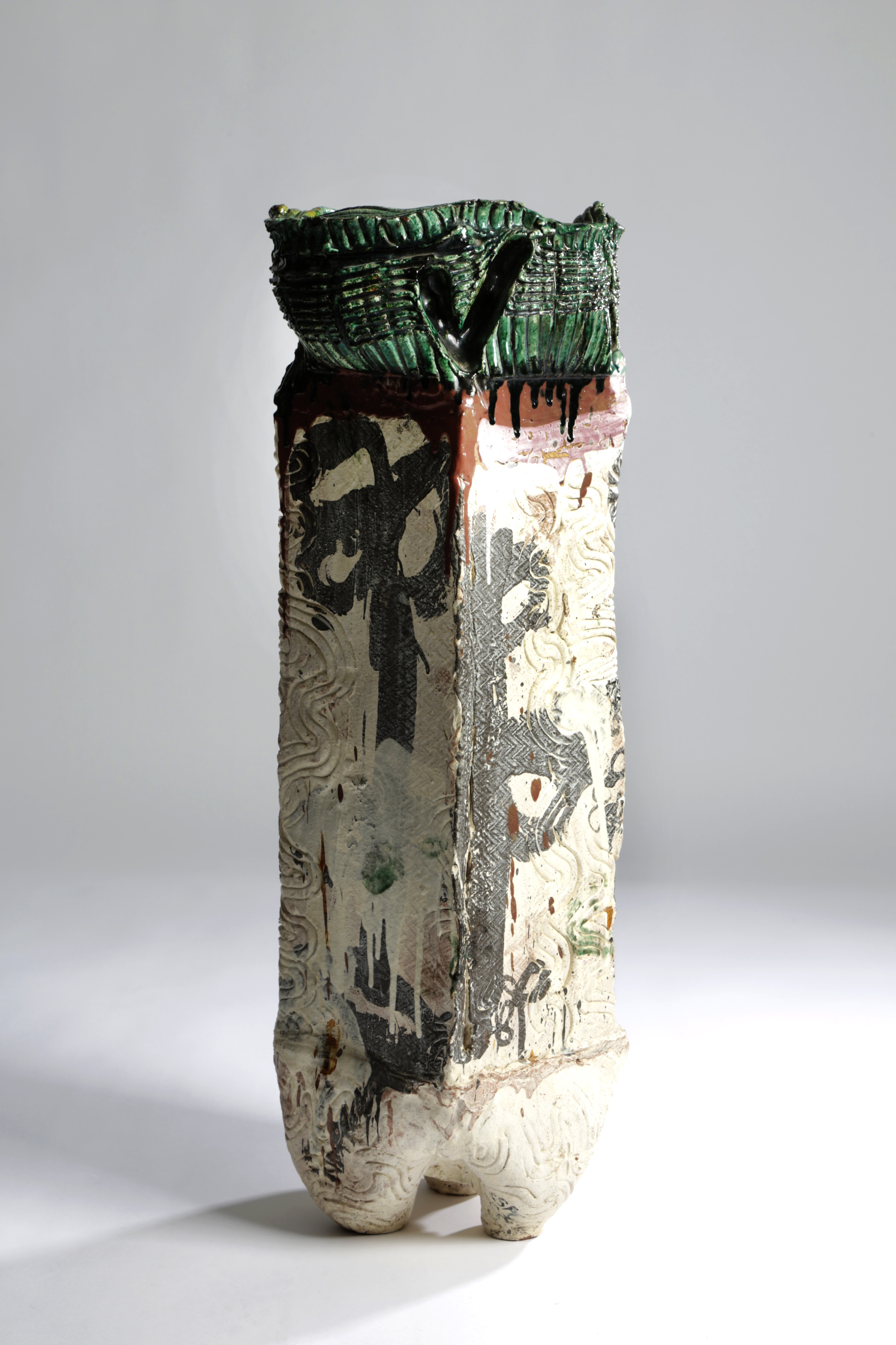 slab-built earthenware, covered in coloured slips and glazes with impressed and incised decoration