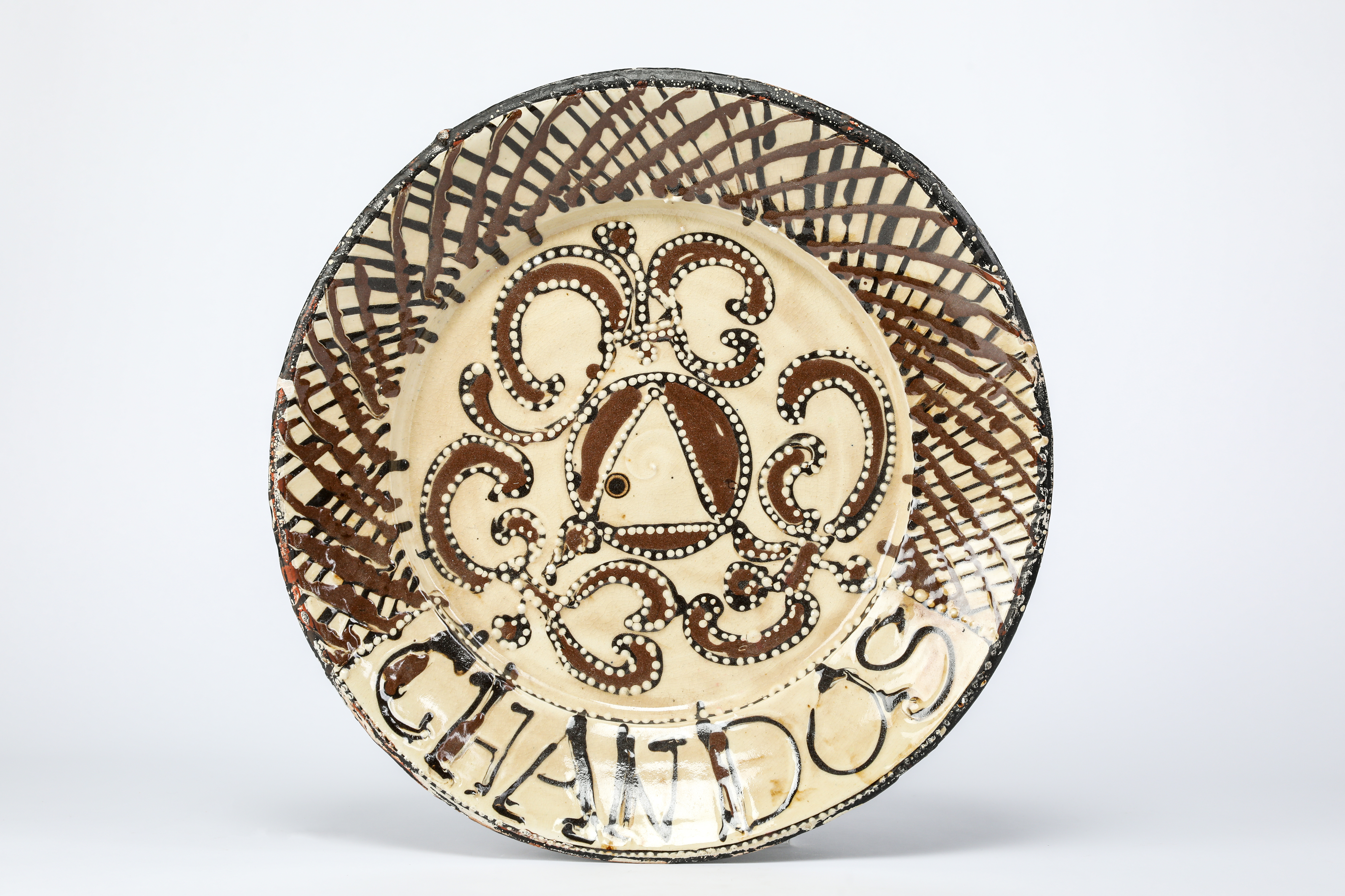 earthenware, with brown and black slip on a pale yellow ground