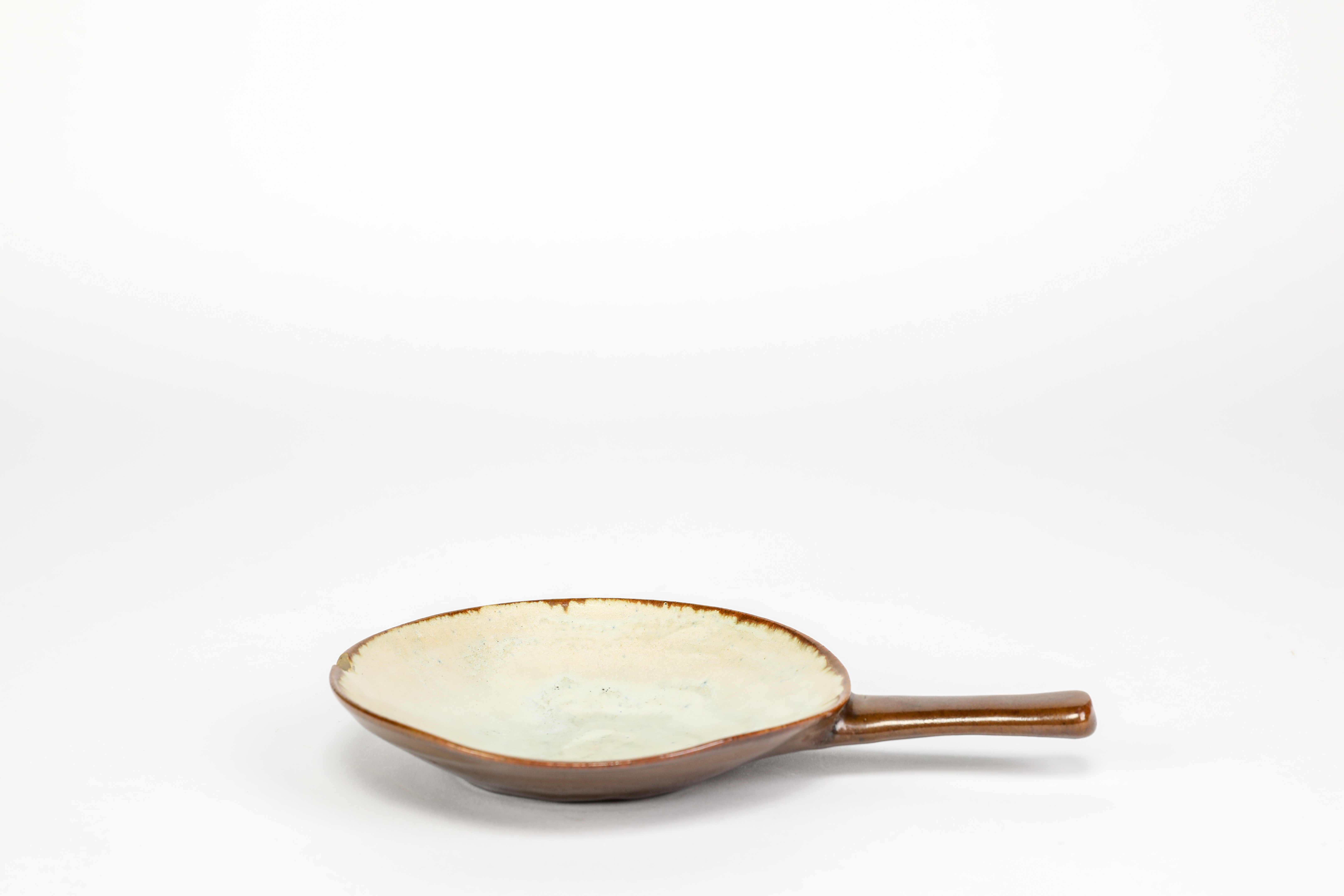 circular with pulled handle, glazed pale celadon to the interior, the exterior chestnut brown
