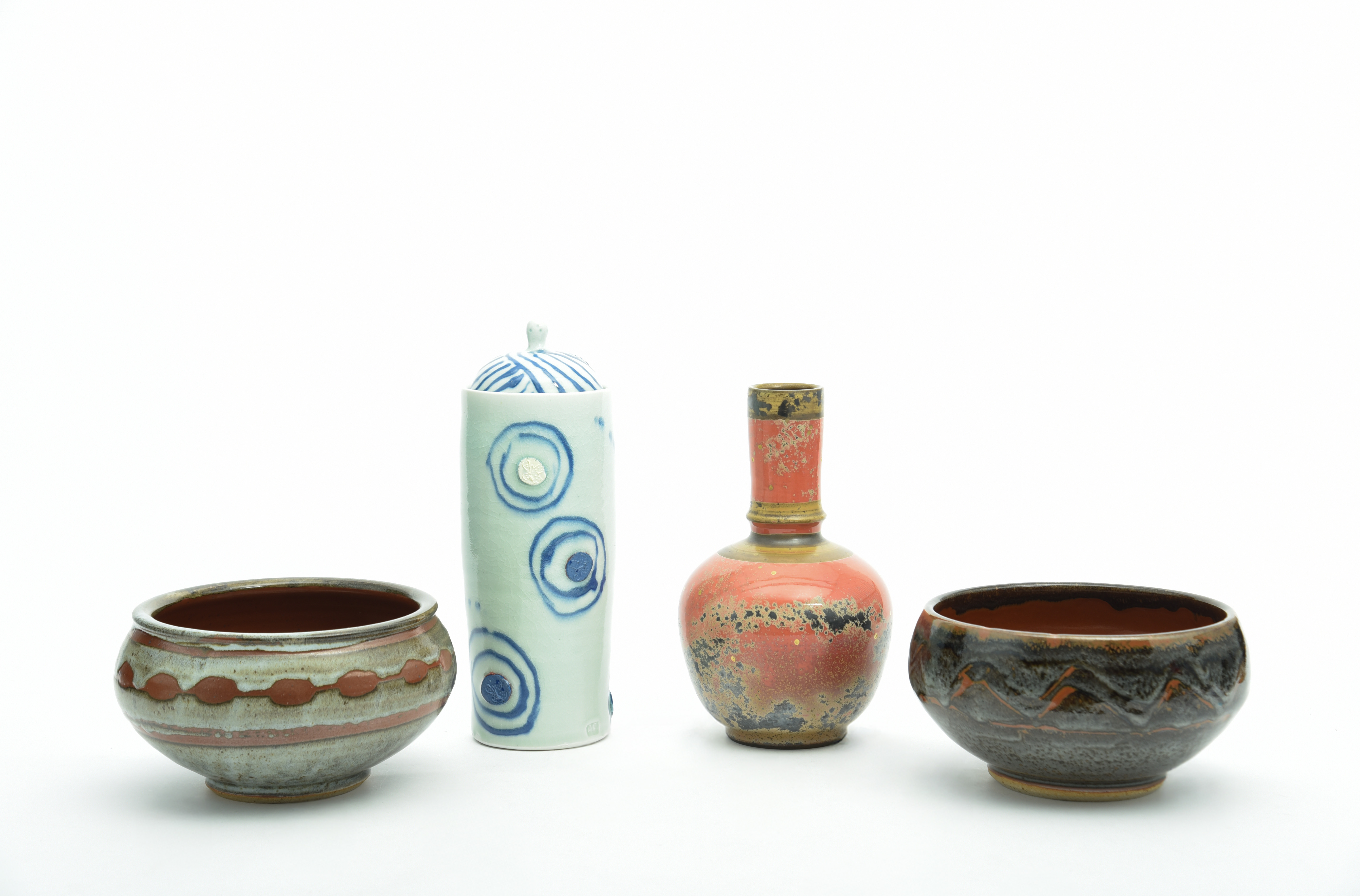 25cm high; and two Muchelney pottery bowls by John Leach, and a cylindrical jar and cover by Adam Frew (5).
