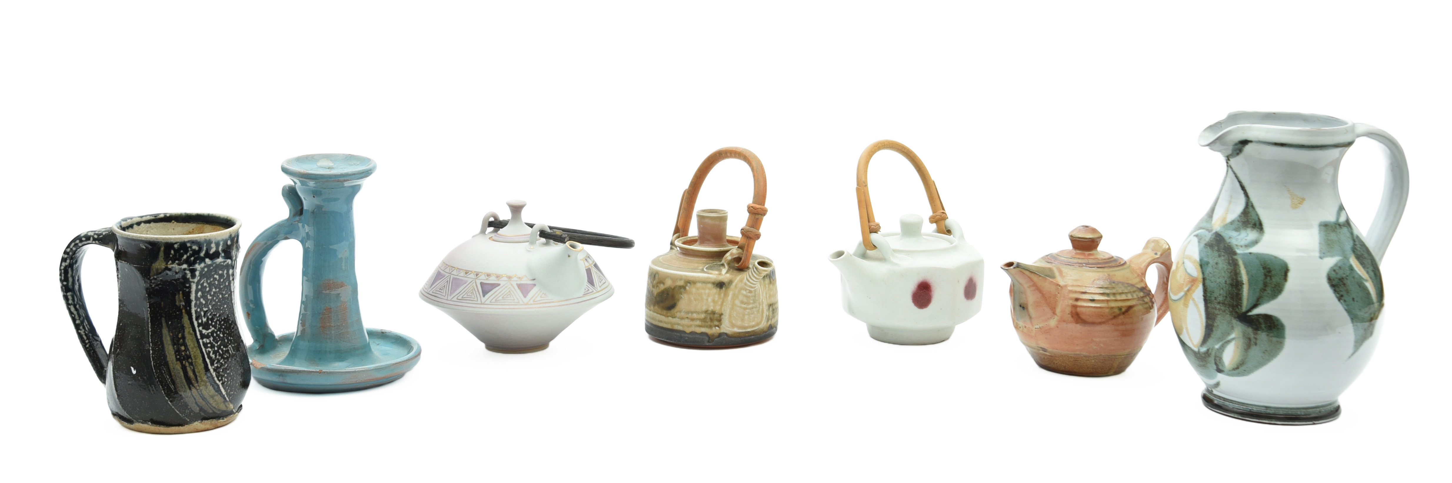 and a smaller Mary Rich teapot, an Ara Cardew teapot, a Derek Emms teapot, a salt glaze mug, and an Aldermaston jug (qty.)