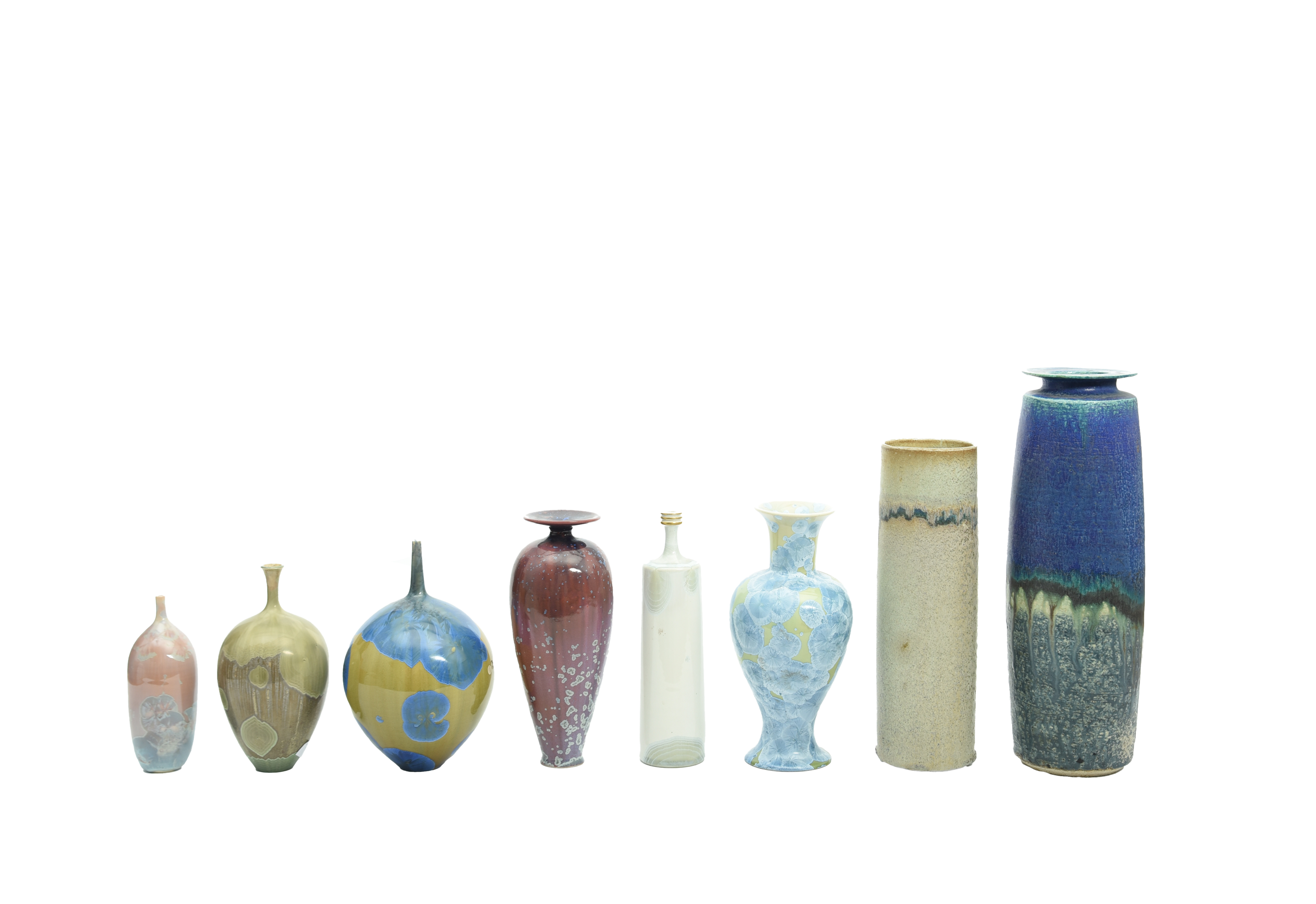 22.5cm high; and two Derek Clarkson porcelain vases, two Derek Davis cylindrical vases, and three crystaline glaze vases (8).