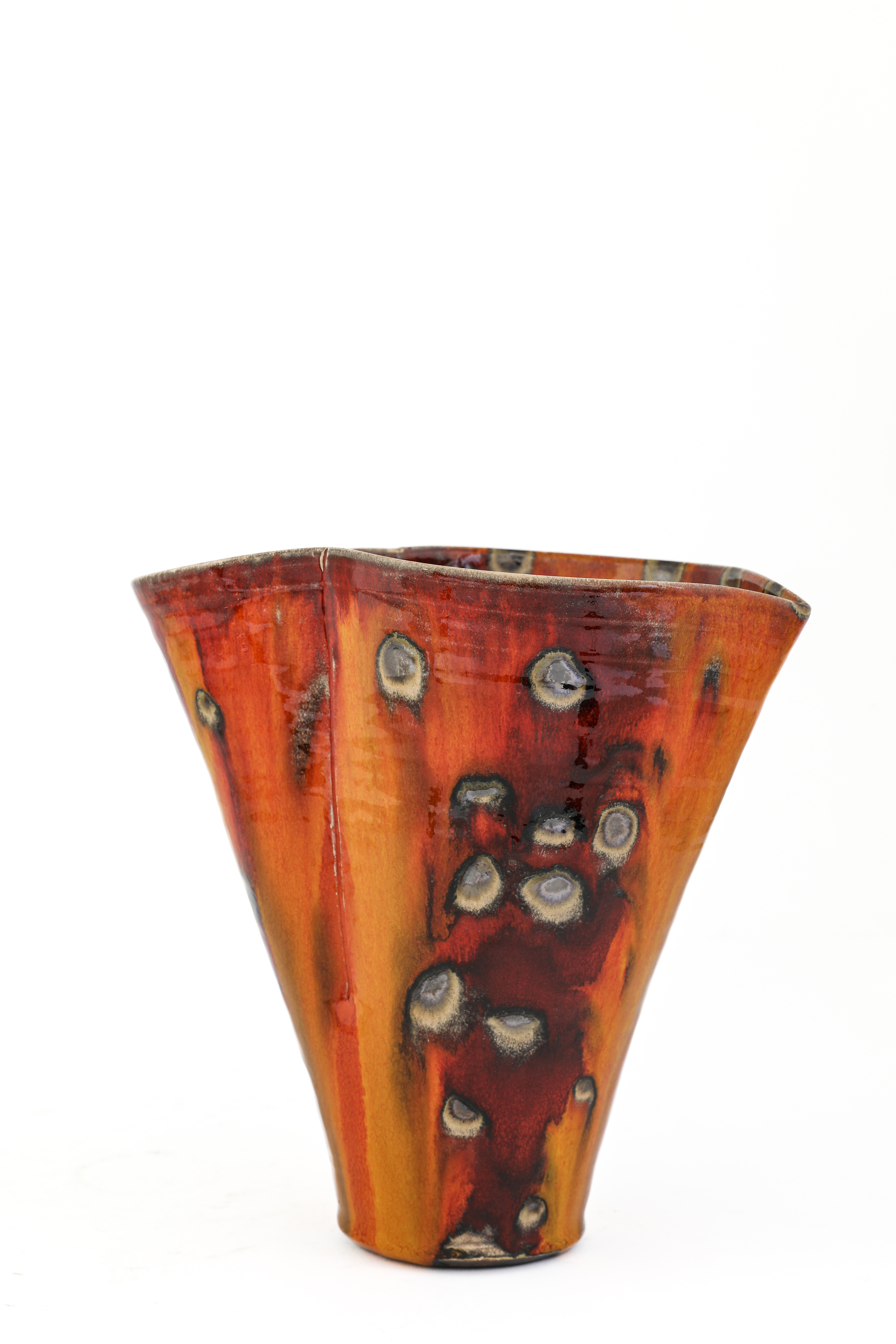 with a red and yellow flowing glaze with manganese spots
