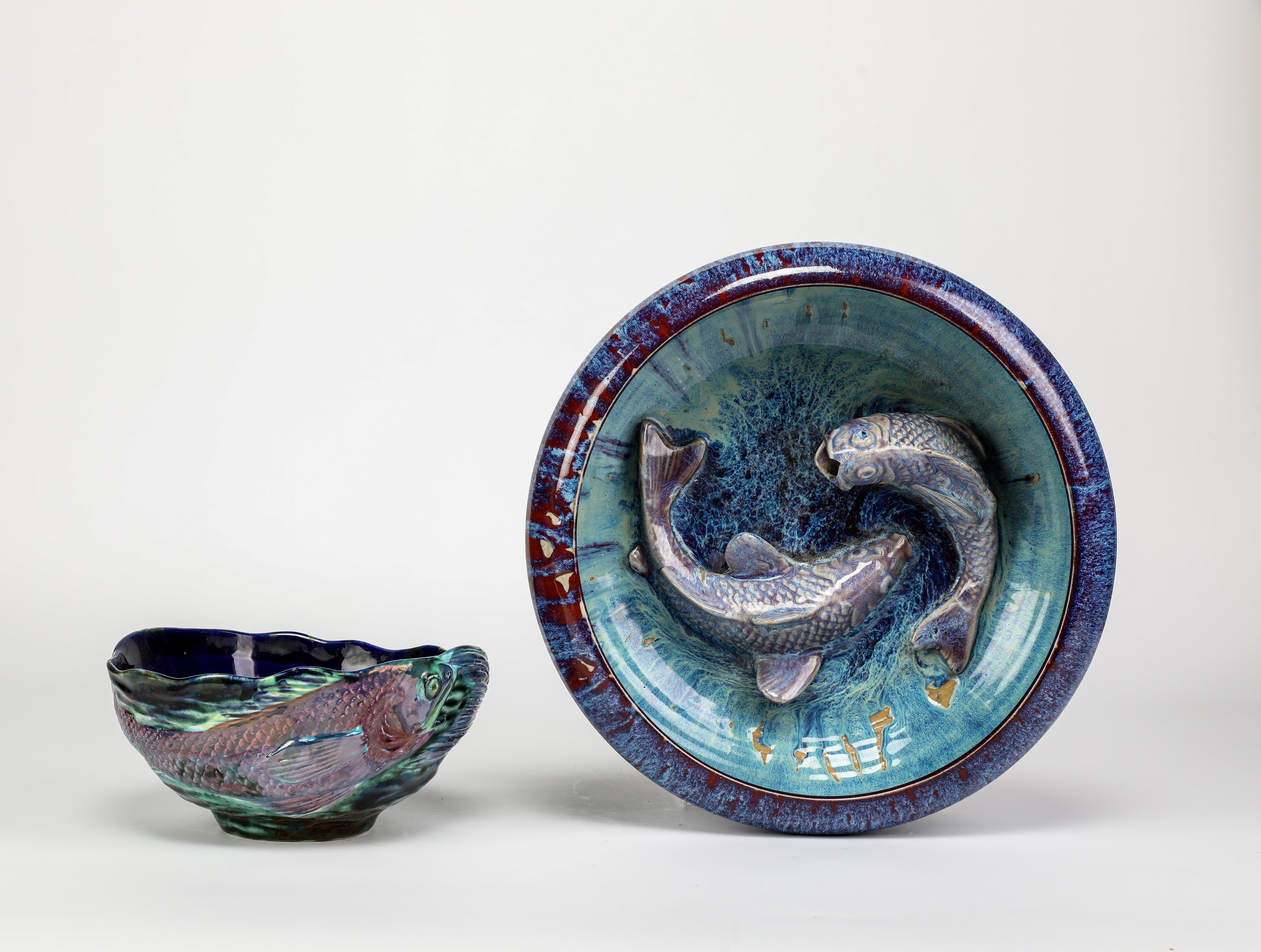 modelled with fish with lustre glaze swimming against a green and blue ground, the interior with a dark blue glaze