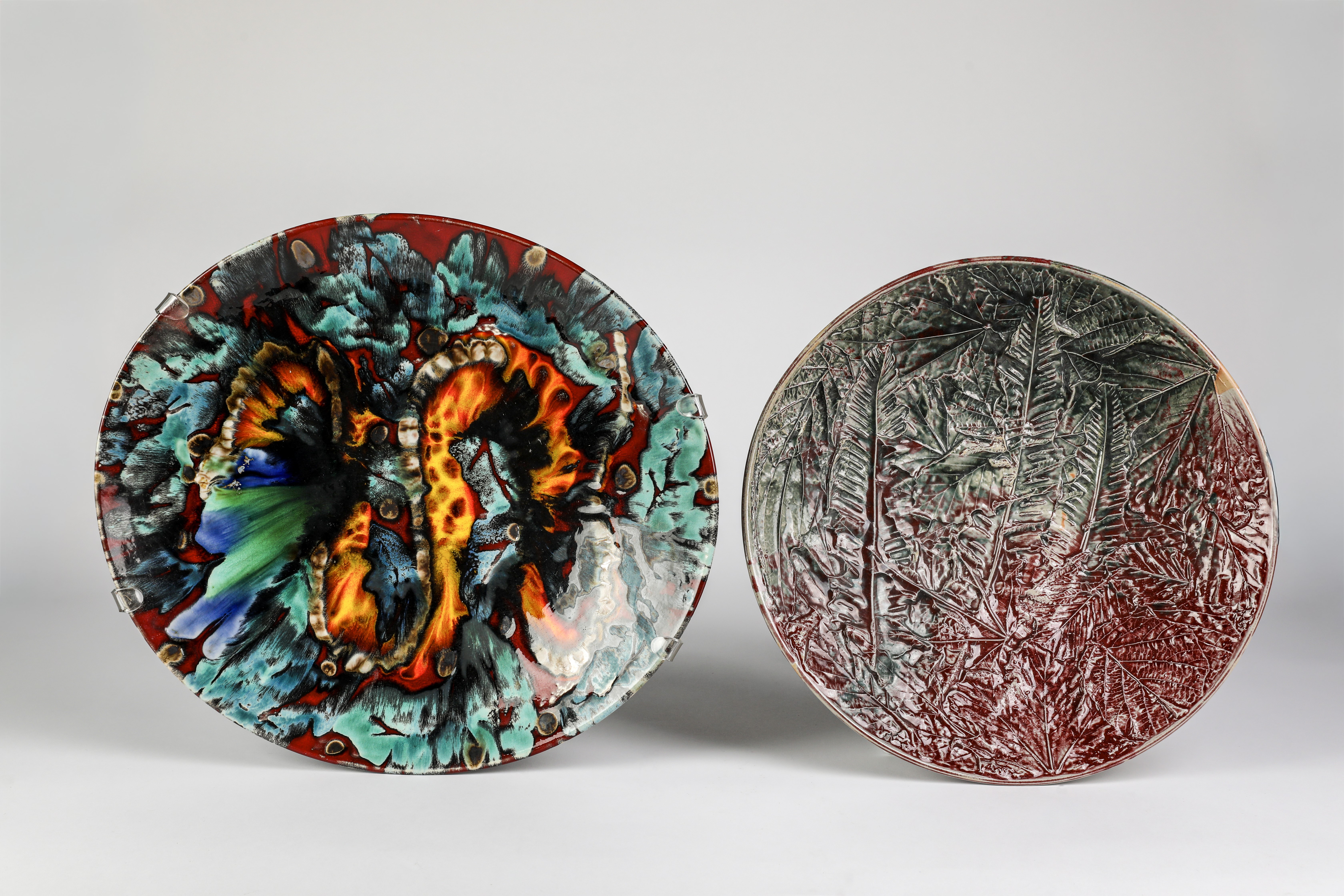 45cm wide; and a charger by Janice Tchalenko, carved with leaves, 37.5cm diameter (2).