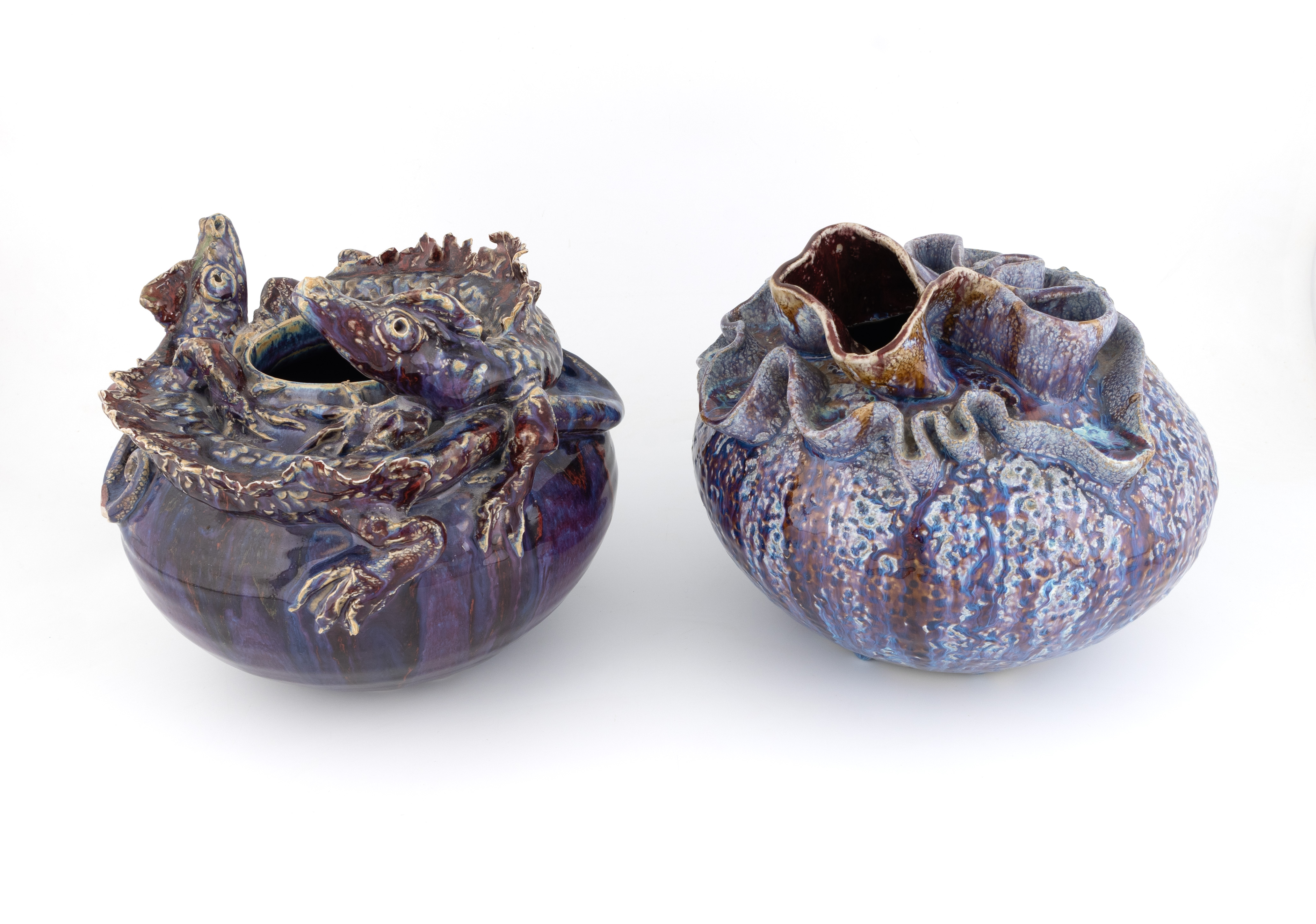 modelled with two dragons around the rim, covered in a running purple glaze