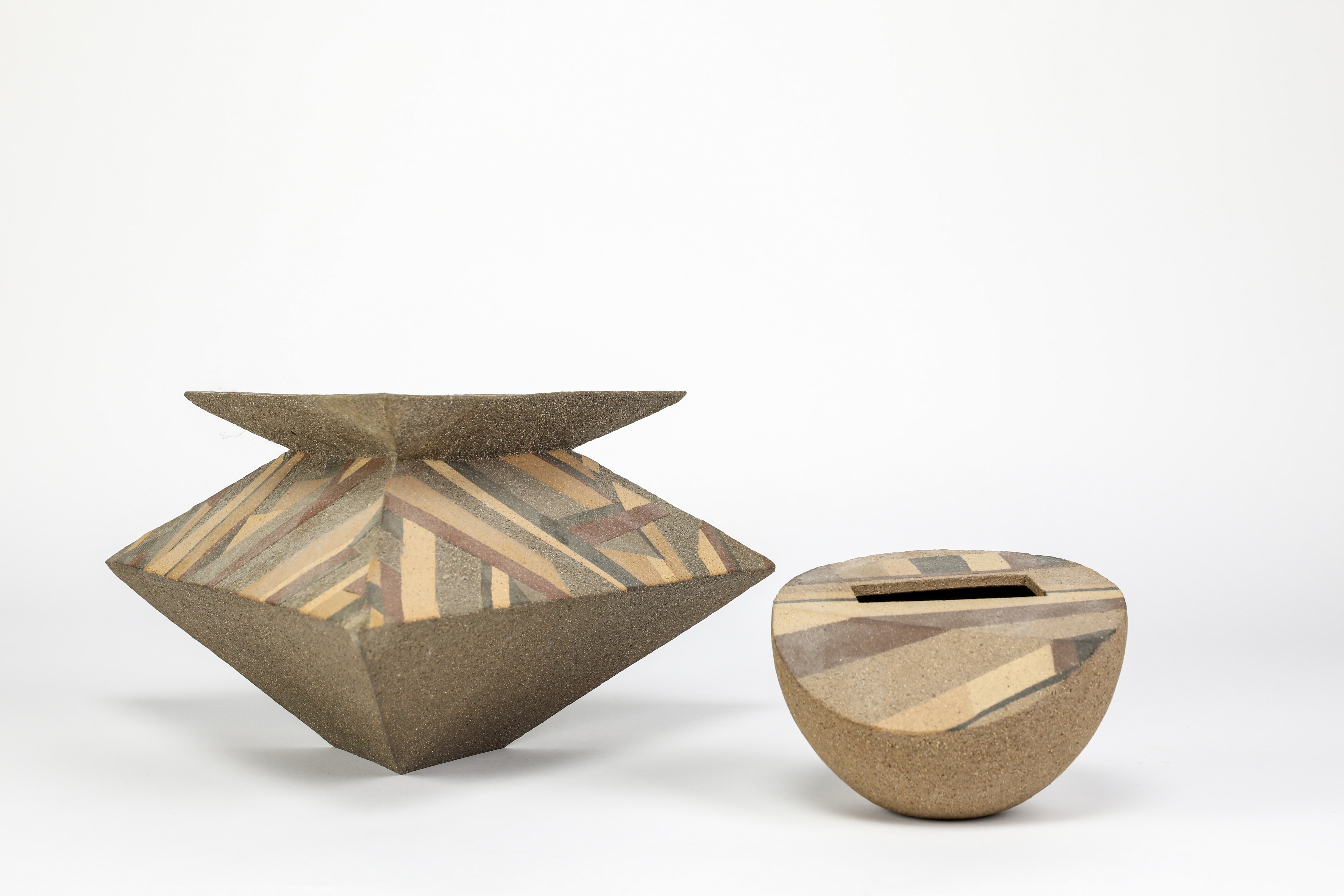 stoneware, triangular form, decorated with geometric patterns in red and ochre