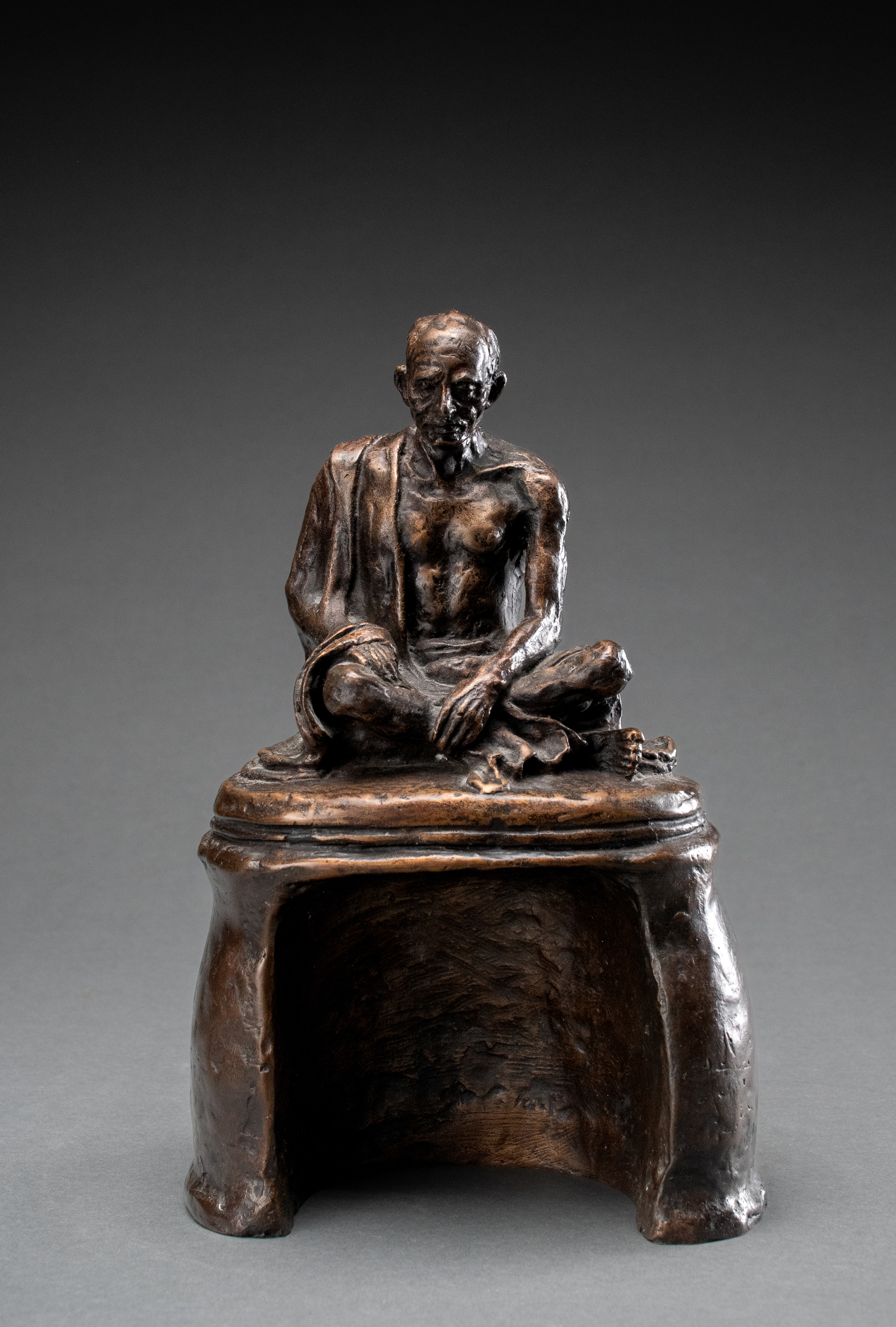 Fredda Brilliant first conceived of the idea of a sculpture of Mahatma Gandhi in 1949, but it was not until the early 1960s that she was commissioned to make the memorial in Tavistock Square, London. She initially explored three poses, one of Gandhi standing, one of him walking, and the final one offered here, sitting cross-legged, a pose she described as "traditional and intimate, suited to the small but beautiful [Tavistock] square". Once a pose had been decided on, Brilliant created a metal armature, the first maquette (the present work), the second maquette (sold in these rooms, 5th June 2019, lot 44, £65,000), before the final figure, one and a half times life size.