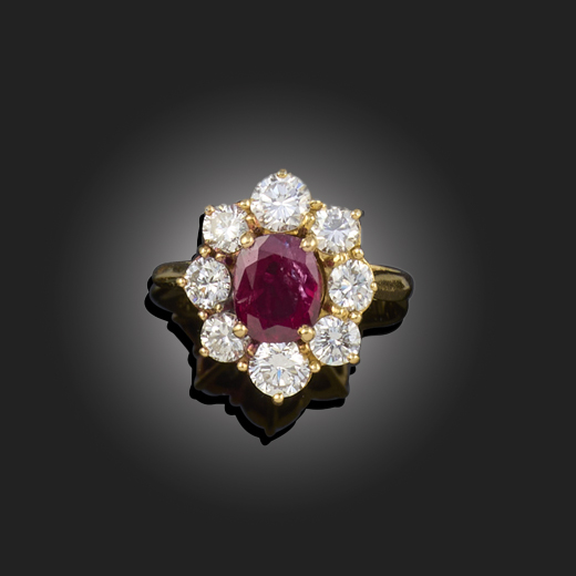A RUBY AND DIAMOND CLUSTER RING, the cushion-shaped ruby set within a surround of round brilliant-cut diamonds in yellow gold, size P 1/2