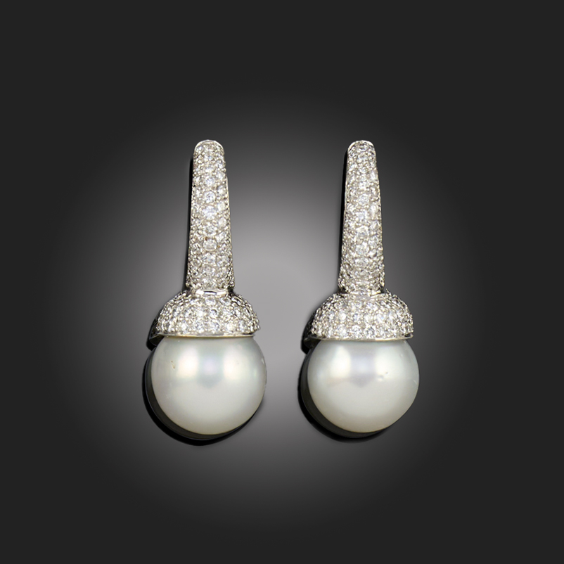 A PAIR OF CULTURED PEARL AND DIAMOND DROP EARRINGS