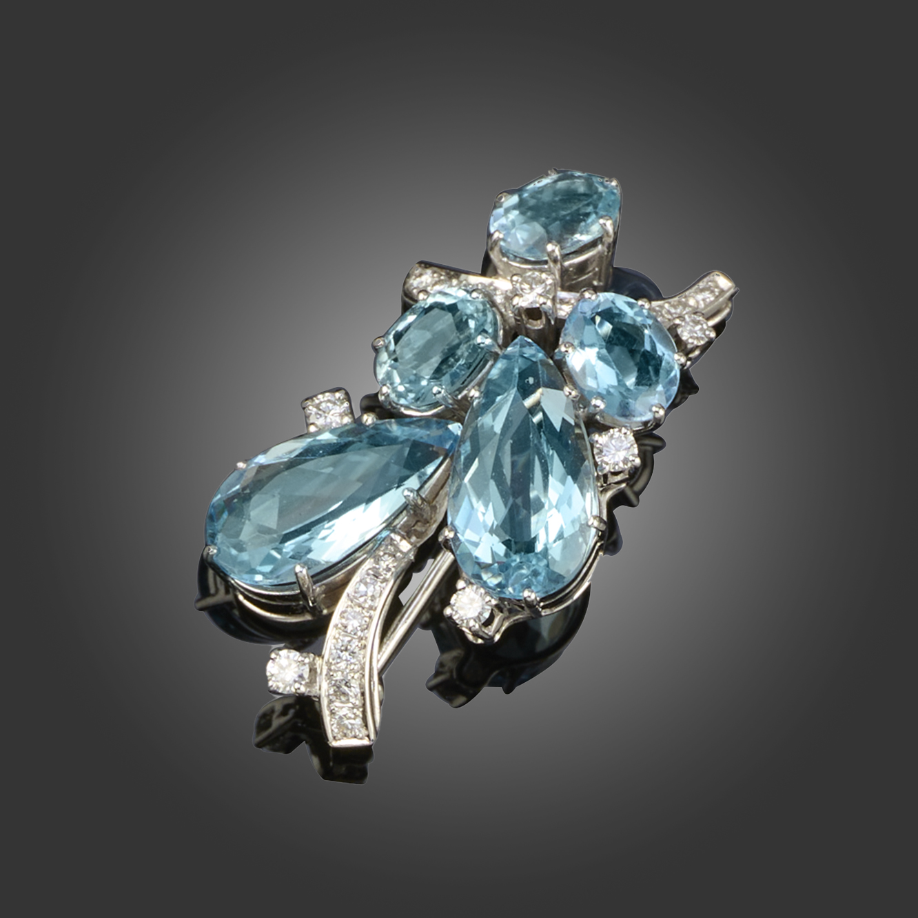 AN AQUAMARINE AND DIAMOND BROOCH, designed as a stylised spray, set with pear and oval-shaped aquamarines and round brilliant-cut diamonds, mounted in white gold, stamped 750, width 3.7cm, gross weight 10g