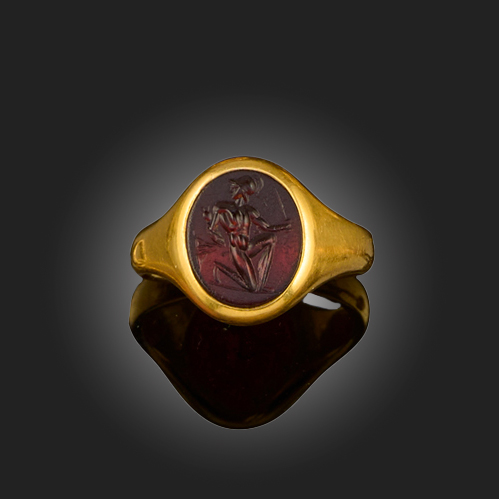 A ROMAN CARVED CARNELIAN INTAGLIO, 1ST CENTURY B.C., depicting a kneeling Diomedes, looking back and holding the Palladium Statuette and a sword in the other hand, length 1.5cm, later gold mount, size P