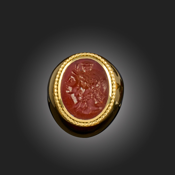 A ROMANO EGYPTIAN CARVED CARNELIAN INTAGLIO, 1ST-2ND CENTURY B.C., depicting Isis and Serapis with the horns of Ammon, length 2.3cm, later gold mount, overall gross weight 19.6g, size N