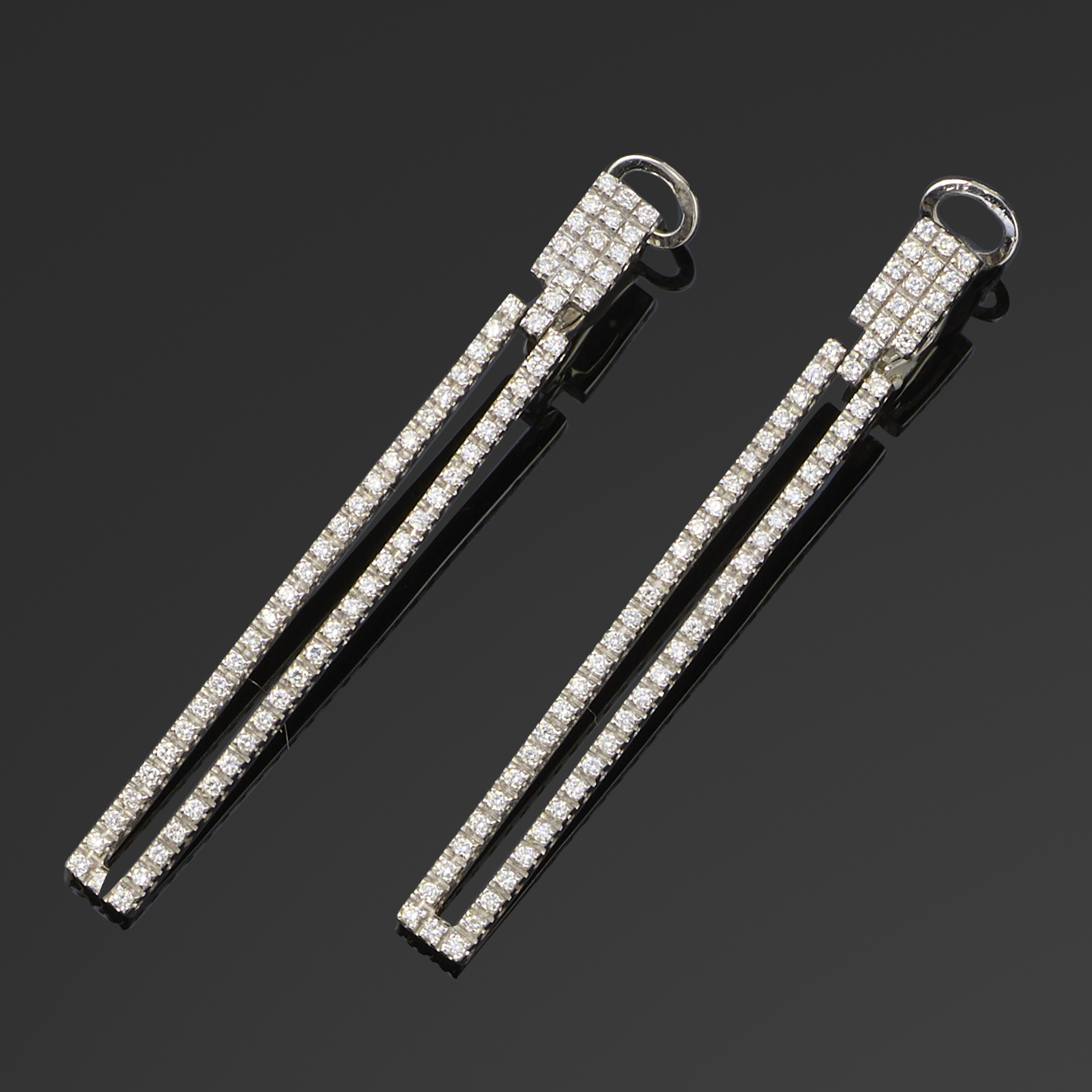 A PAIR OF DIAMOND DROP EARRINGS, the rectangular surmounts set with round brilliant-cut diamonds and suspending pierced rectangular drops with further diamonds in white gold, stamped 750, post and clip fittings, length 5cm