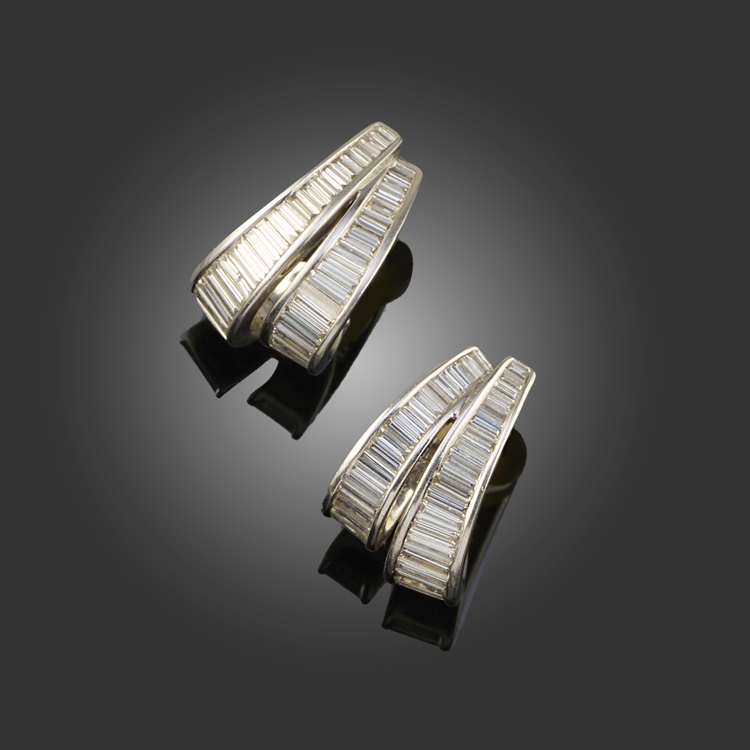 A PAIR OF DIAMOND SCROLL EARRINGS, set with two scrolls each channel-set with graduated baguette-shaped diamonds in white gold, stamped K19, post and clip fittings, length 2.2cm