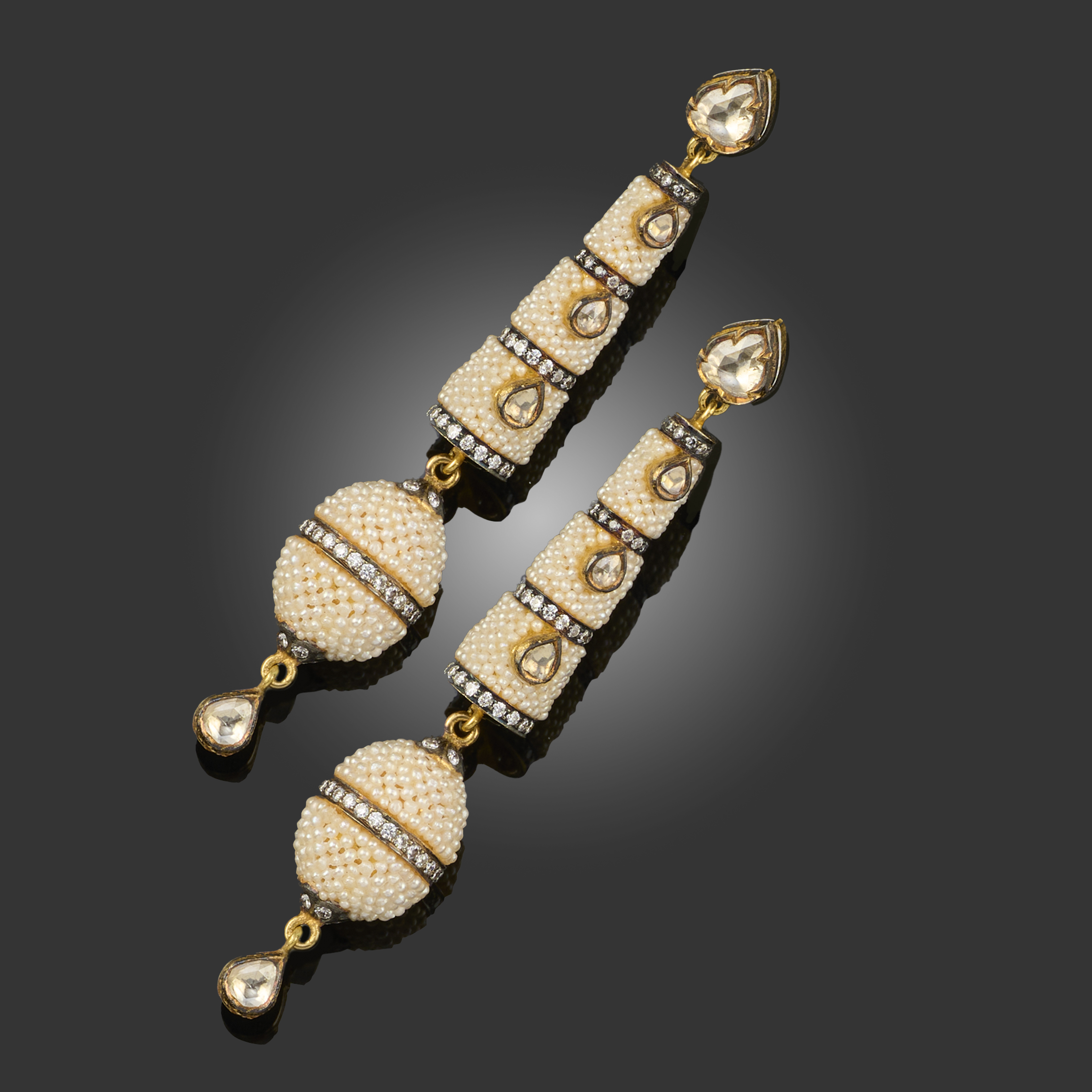 A PAIR OF SEED PEARL AND DIAMOND EARRINGS, each with a diamond-set surmount suspending a cone of seed pearl bands each centred with a lasqué-cut diamond alternating with borders of round brilliant-cut diamonds, above an ovoid seed pearl pendant with a diamond-set border and suspending a diamond drop, all in gold, post fittings, length 7cm, gross weight 18.7g