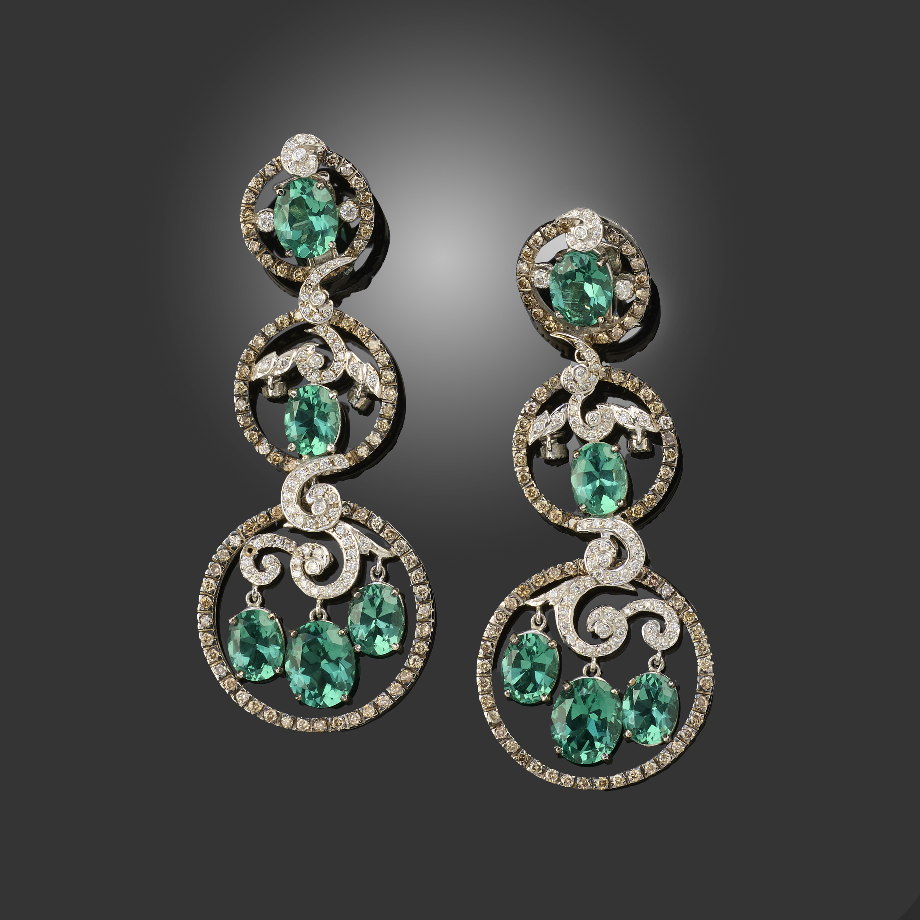 A PAIR OF PRASIOLITE AND DIAMOND DROP EARRINGS, designed as graduated openwork connected circles, each set with oval prasiolites and diamond scrolls within a surround of brown diamonds in white gold, stamped 18k, clip fittings, length 7.2cm