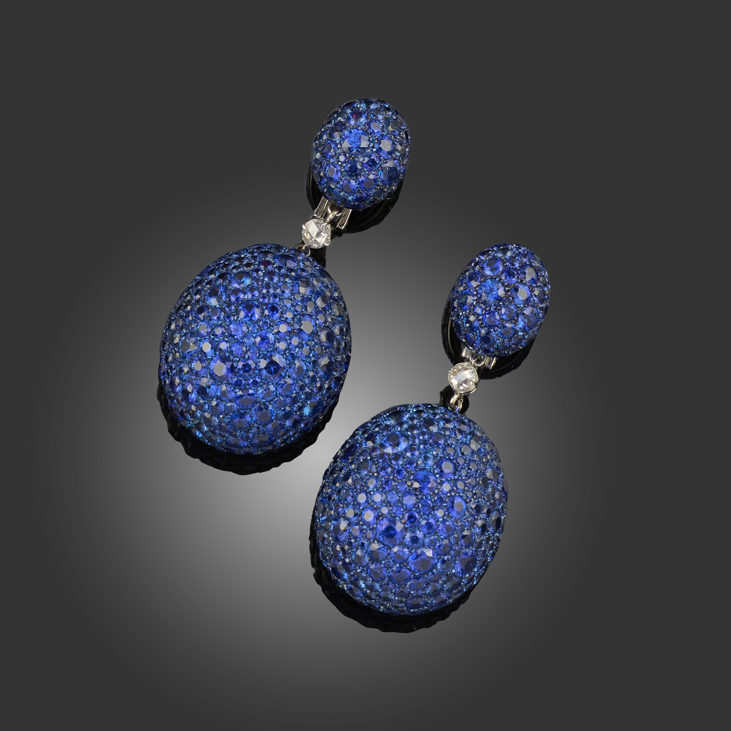 A PAIR OF SAPPHIRE AND DIAMOND EARRINGS, each composed of a bombé surmount pavé-set with circular-cut sapphires, suspending a rose-cut diamond above a larger spherical pendant similarly pavé-set with sapphires, mounted in white and blue gold, Italian control marks, stamped 750, clip and retractable post fittings, length 5cm, gross weight 24.8g
