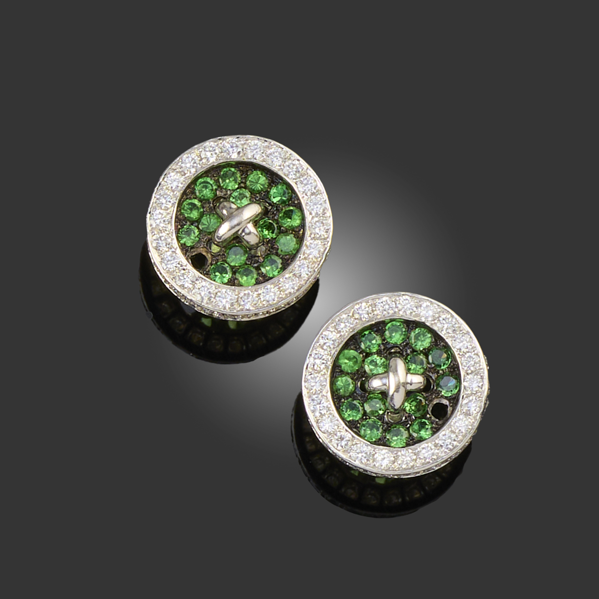 A PAIR OF TSAVORITE GARNET AND DIAMOND EARRINGS, each of circular design, with an 'X' to the centre of a tsavorite-set panel, within a border set with round brilliant-cut diamonds, in white gold, one tsavorite missing from each earring, diameter 1.5cm, post fittings