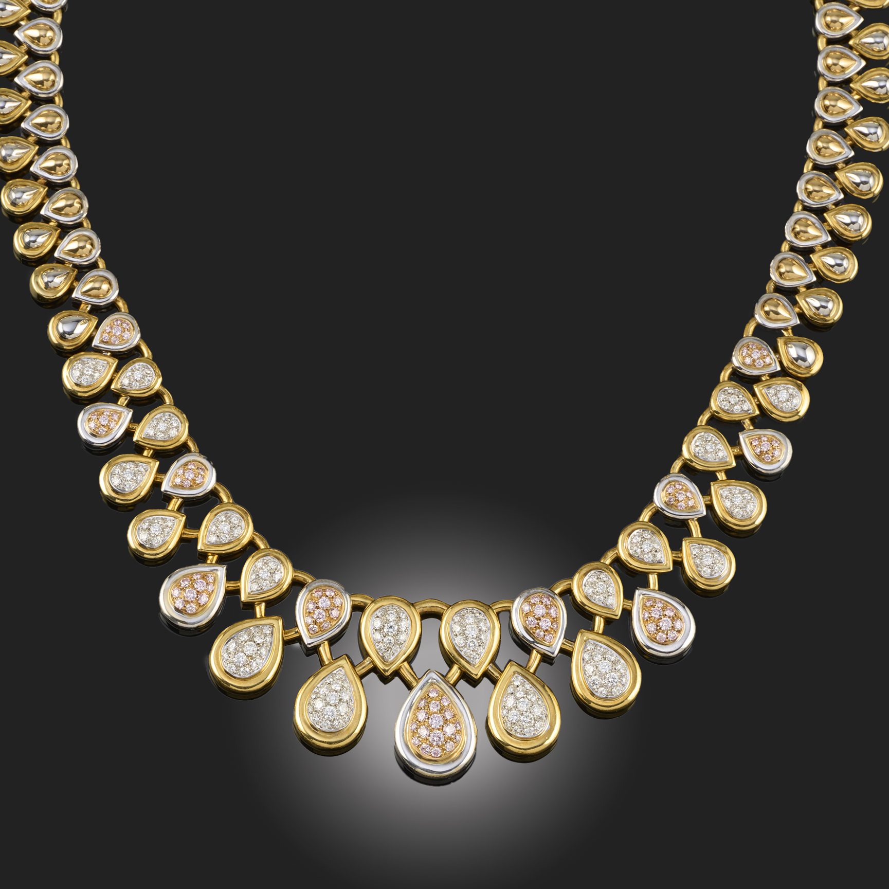 A PINK AND WHITE DIAMOND FRINGE NECKLACE, of tapering teardrop-shaped settings alternately pavé-set with round brilliant-cut white and pink diamonds in yellow and white gold settings respectively, stamped 750 and London import marks for 1994, length 43.5cm, 160g